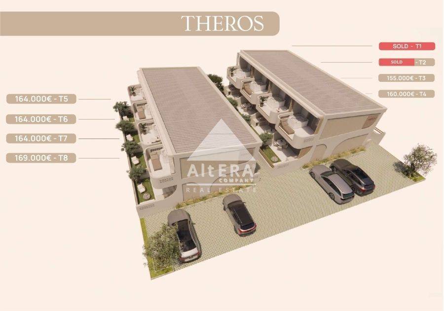 Η κατασκευή του THEROS 1 ξεκινά τον Σεπτέμβριο του 2025 και ολοκληρώνεται το καλοκαίρι του 2026, ενώ το THEROS 2 ακολουθεί έξι μήνες αργότερα. Η αγορά από τα σχέδια προσφέρει ιδιαίτερα χαμηλές τιμές, εξασφαλίζοντας μια συγκεκριμένη κατοικία, ενώ στον πελάτη δίνεται η δυνατότητα να επιλέξει χρώματα και υφές υλικών από μια μεγάλη γκάμα που του προσφέρεται. Η αποπληρωμή γίνεται σταδιακά σε 5 δόσεις κατά τη διάρκεια της κατασκευής του έργου. Η τιμή συμφωνείται εξαρχής και ο αγοραστής έχει τη δυνατότητα να παρακολουθεί το έργο και να ελέγχει πριν από κάθε πληρωμή.