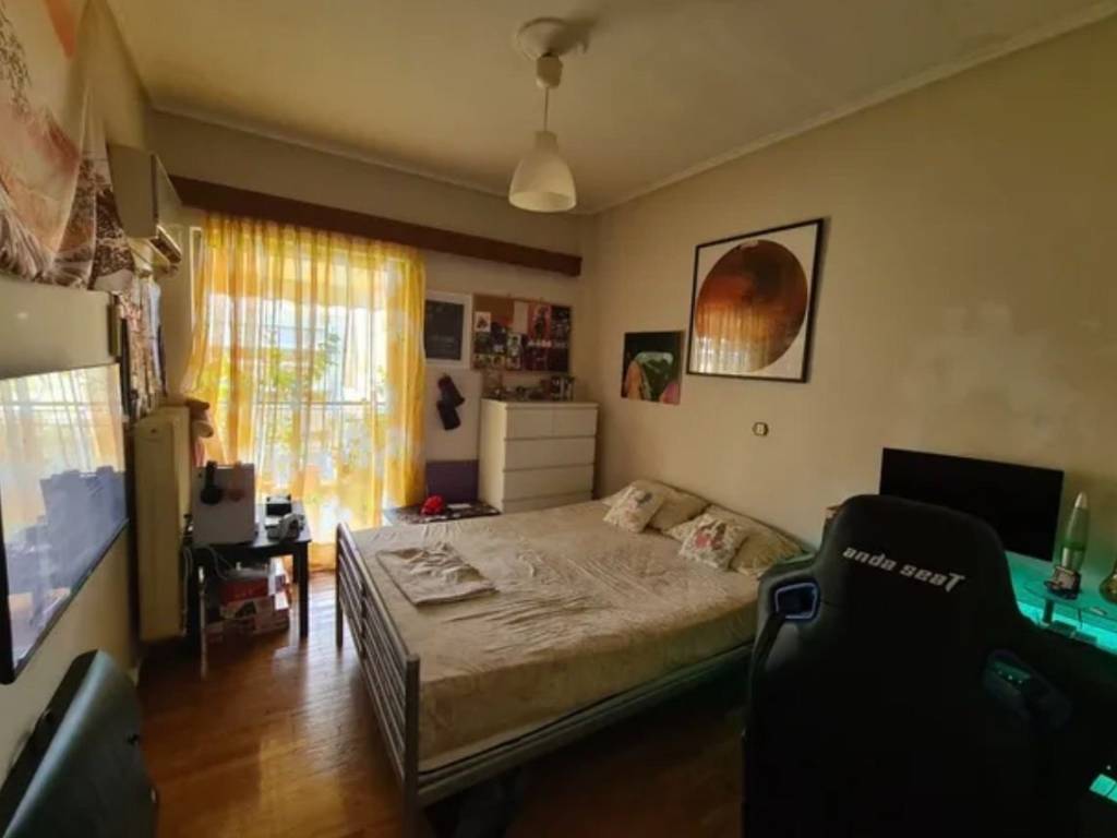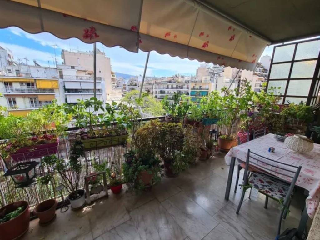 Οροφοδιαμέρισμα 100 τμ, ρετιρέ, διαμπερές, με τέντες, εξώπορτα σκαλιστή μασίφ με μπάρα ασφαλείας, τζάκι με επένδυση πλάκας Καρύστου, κουζίνα ξύλινη καρυδιά μασίφ με πάσο, πλακάκια ιταλικής προέλευσης.