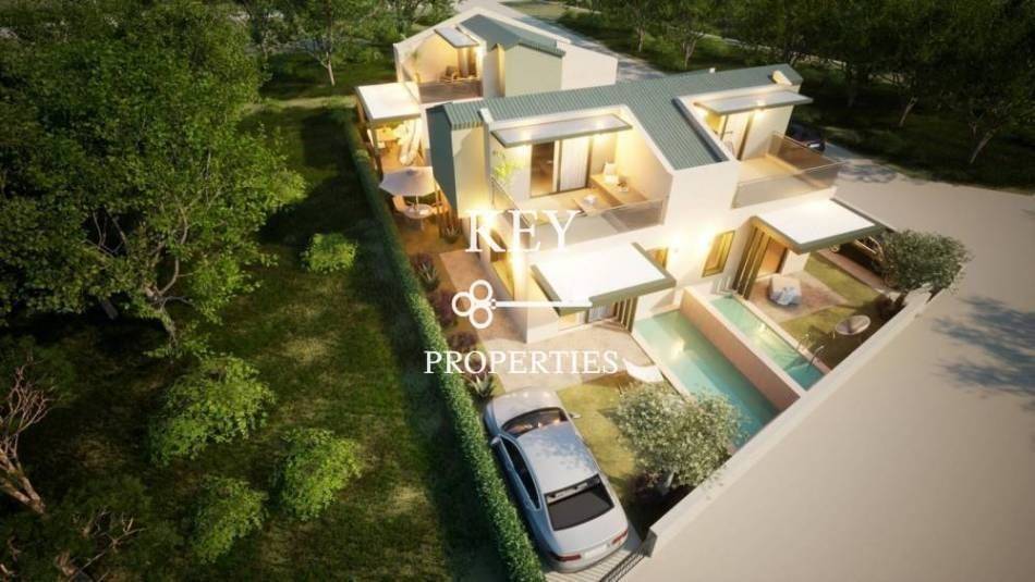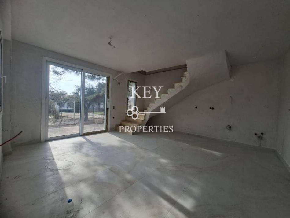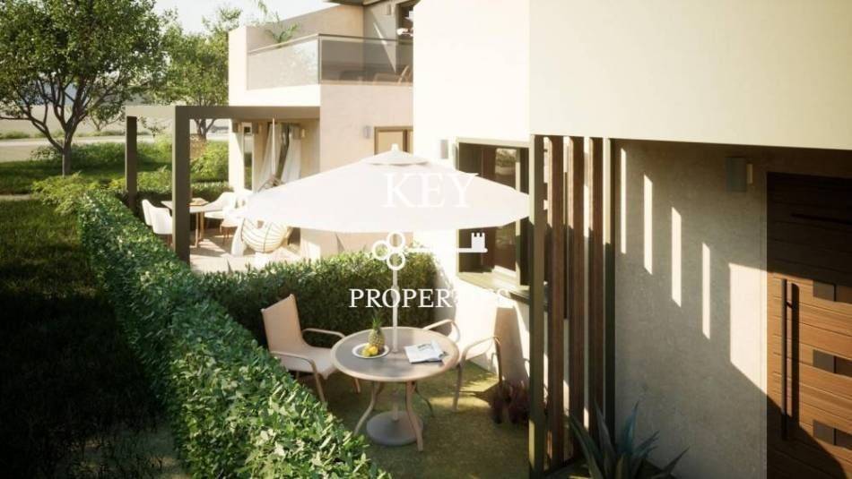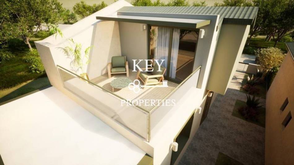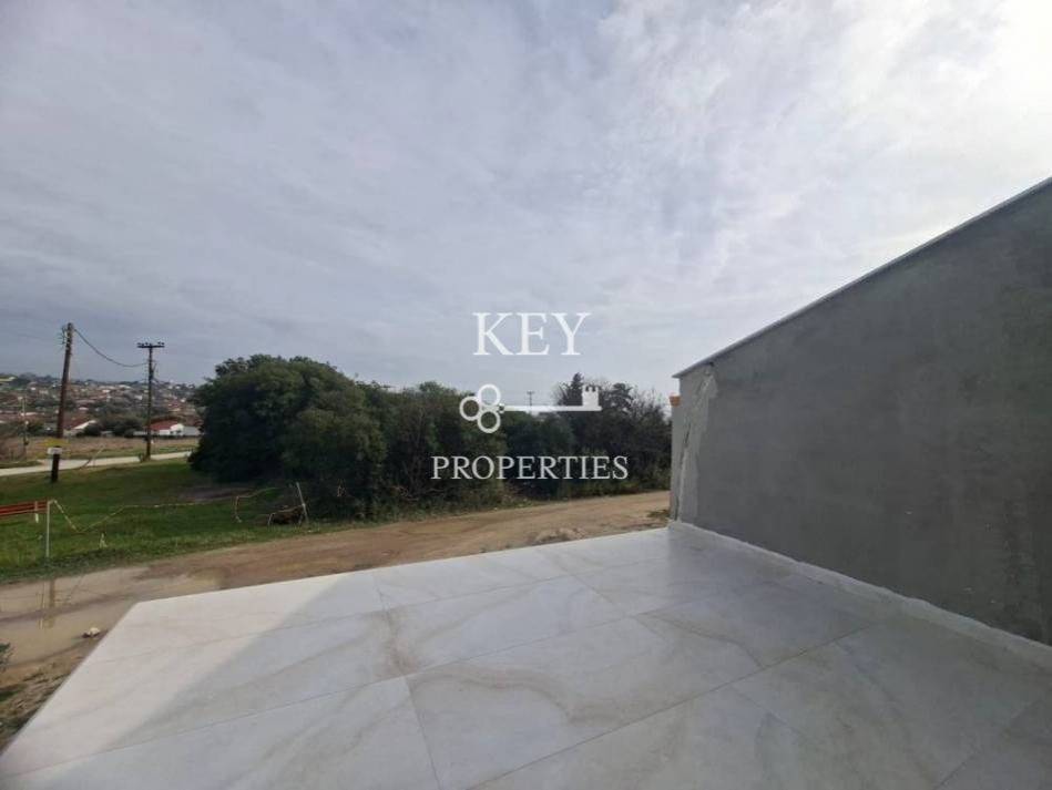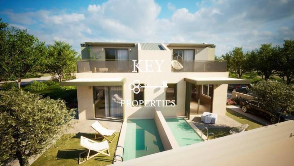 Luxurious newly built maisonette, with sea view, 80sq m (72sq m net), for sale 180m. from the beach. It is developed on two levels, has two spacious bedrooms, a bright open plan kitchen with living space, two bathrooms and storage space. It has a private garden, swimming pool, large verandas, air conditioning, solar water heater, armored door, double glazing window frames with insect screens and a parking space. It is situated in an ideal location, close to supermarkets, shops, beach bars and restaurants.