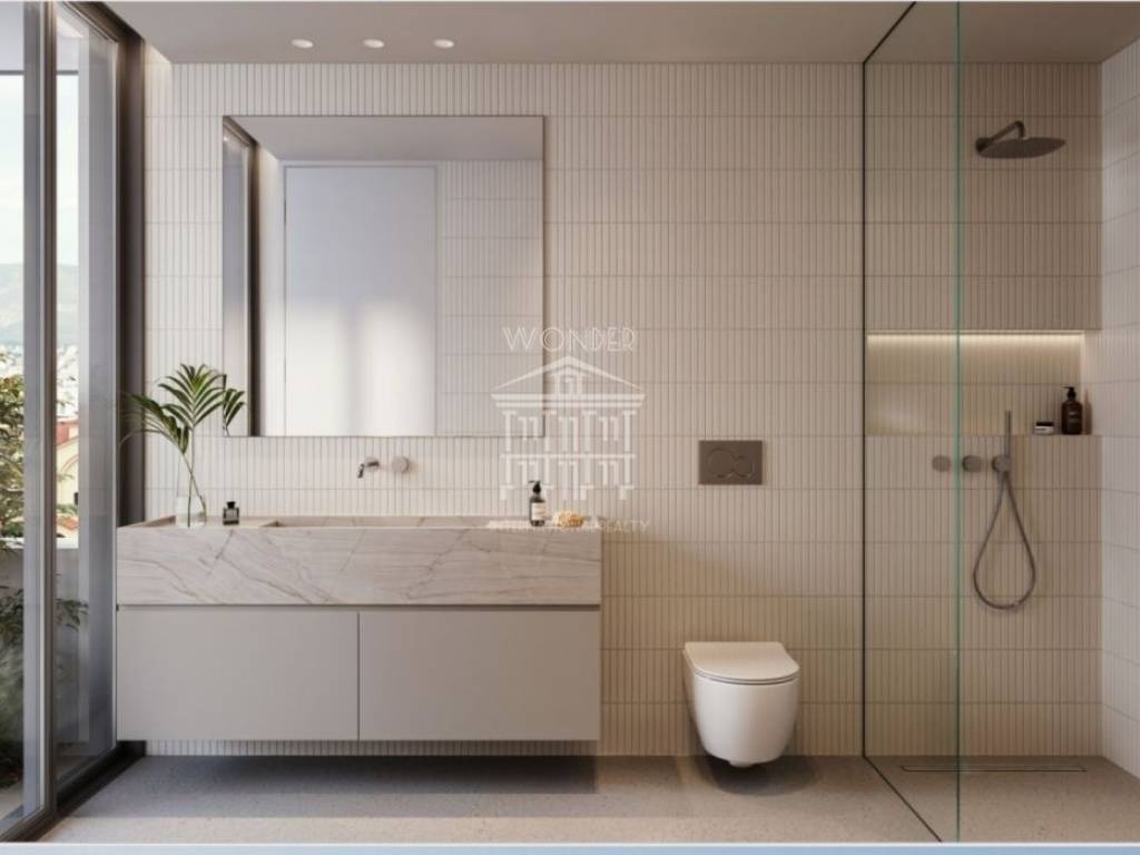 It offers 2 bedrooms, an elegant open-plan living room with kitchen, 2 bathrooms, and a WC.