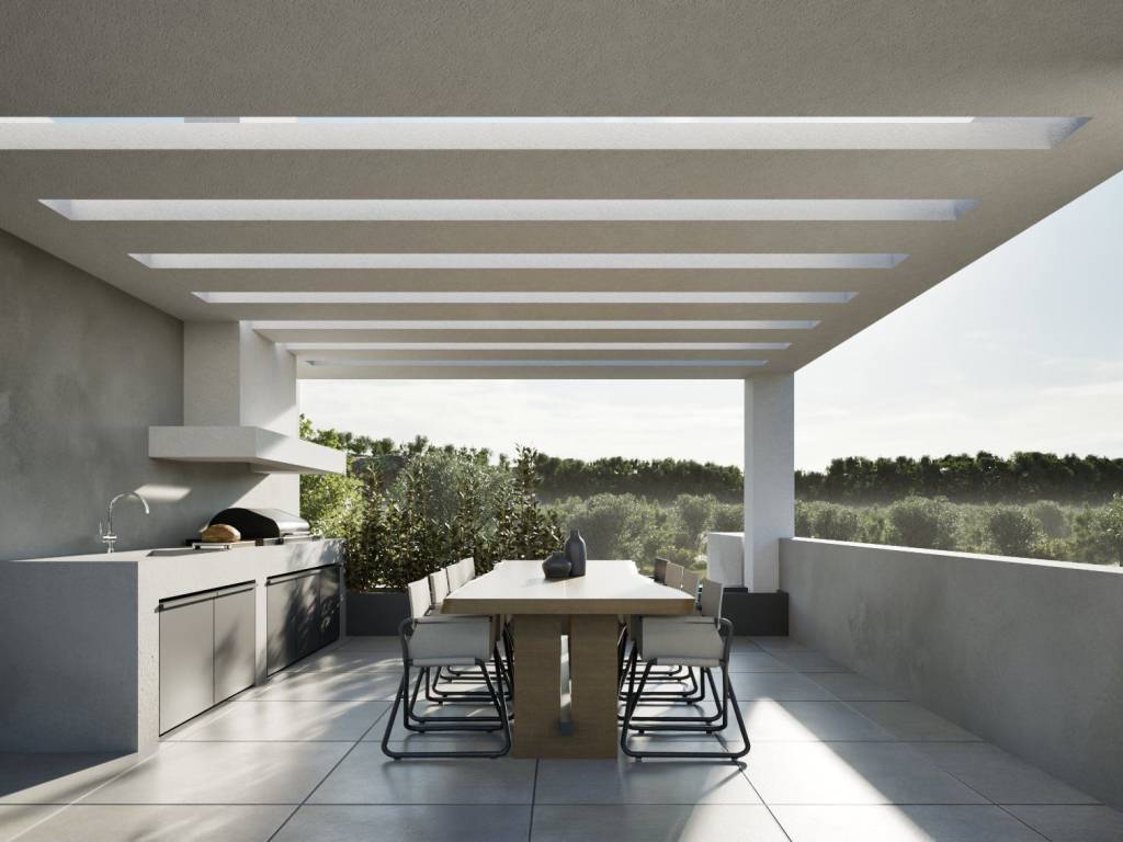 Exceptional 99 sq.m. apartment, distinguished by its modern design and located in a prime, high-demand area. The property is constructed with high-quality materials and features numerous smart home automations. The ultra-luxurious apartment is situated on the second elevated and third floor of a three-story building and includes two bedrooms. On the first floor, the bright and spacious living-dining area and the modern kitchen are surrounded by a large 13 sq.m. balcony. Two comfortable bedrooms, two bathrooms and a separate laundry/storage area shape the nighttime zone of the residence. Additionally, it offers two covered parking spaces and storage. Exclusive use roof garden of 99 sq.m. with a pergola and elevator access. There is pre-installation for a barbecue area, an ideal space for gatherings and endless moments of relaxation while enjoying the magnificent sunsets. The project will be completed in the summer of 2027. Location: Thermi is located in the southeastern part of Thessaloniki, approximately 15 kilometers from the city center. Unique Characteristics: Thermi has become one of the most affluent suburbs of Thessaloniki, having experienced significant development in recent years. The area comprises many newly built properties as well as maisonette complexes. In the wider area, residents find the Mediterranean Cosmos Mall in close proximity, one of the city's largest shopping centers offering a variety of options for visitors. Additionally, there are several private schools in the area. In Thermi lies the dam, providing a breath of greenery for the residents and enhancing the area as it boasts a rich natural environment, ideal for short escapes from the city. Another historical site in the area is the Thermi Baths, which may be upgraded in the coming years through a project aimed at their development. Accessibility: Near Thermi, the National Road 16 and Highway 24 pass by, connecting Thermi with the rest of Thessaloniki. The OASTH services the area with two bus lines. Investment Potential: The population of the area is steadily increasing, attracting a large number of investors.