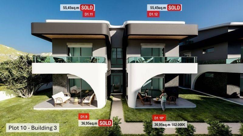 • 12 Ground floor apartments from 36,95sq.m to 37,52sq.m, consisting of a living room with kitchen, 1 bedroom, 1 bathroom.