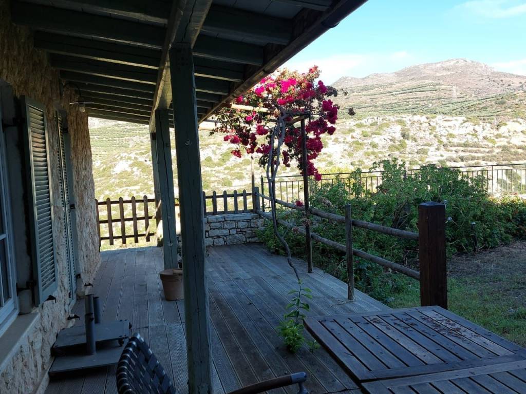 Maronia, Sitia, East Crete: Unique stone villa built to high quality 8km from the sea. The property is located on a plot of 2460m2 within the village plan and has olive trees. The first floor is 75m2 with two verandas of 45m2 and 20m2 enjoying fantastic mountain views. It consists of a very comfy open plan living kitchen area, a bedroom and a bathroom. The ground floor is approximately 110m2 consisting of three large bedrooms and a lovely kitchen which serves the three bedrooms, a large bathroom of 17m2 and a smaller bathroom. A beautiful big kitchen – living area with fire place and a big veranda about 18m2 and an internal staircase leading to the 1st floor. There is also a basement used as a store room approximately 60m2 and a large 80m2 garden with flowers and fruit trees. The guest house which is in the garden is approximately 35m2 with a fire place, a living - kitchen – bedroom area and a W.C. It also has a veranda of 25m2. The property’s construction is sustainable, electrical, plumbing installations as well as the high-quality wooden and premium quality tiled floors were made by German companies with high standards. There is underfloor heating throughout the upper house and for the small house there is possibility to connect to central heating. Furthermore, the first floor has the possibility for photovoltaic or solar installation. The house has two rainwater collection tanks, approximately 49 km and connection to the community sewer network. All services are connected. Lastly, the property enjoys views to the valley, mountain and the village.