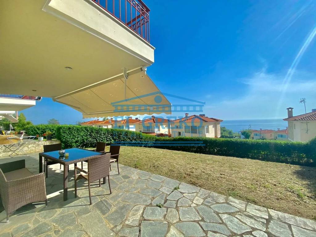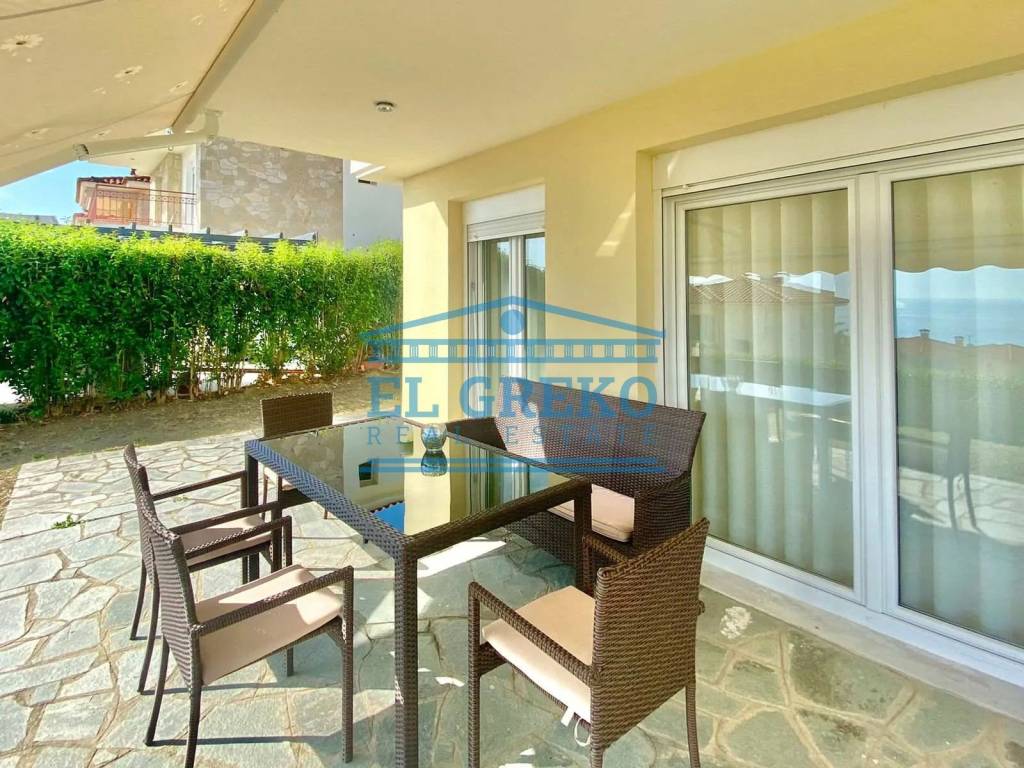 For sale a furnished 2-storey detached house of 110 m² on the plot of 364 m² with panoramic sea view. The layout of the house is as follows: - Ground floor: spacious living room with open plan kitchen, WC - 1st floor: 3 bedrooms, bathroom and verandas Also, there is: - diesel heating - fireplace - 4 A/C units - solar water heater - electric appliances - storeroom - safety door - parking place The distance to the beach is 800 meters.