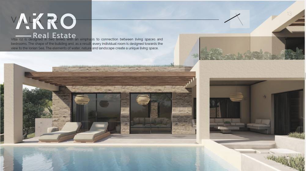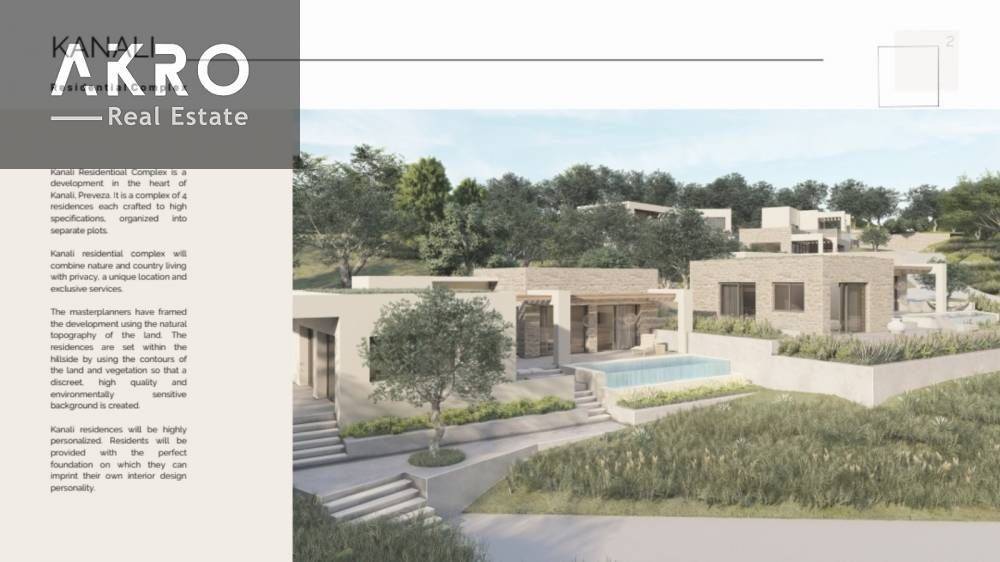 The complex is set in an elevated position above the village of Kanali, enjoying unobstructed views of the Ionian Sea, and is just a short drive from the village center and Monolithi Beach, one of the largest sandy beaches in Europe. Nearby are the town of Preveza, Marina Prevezas, and Aktion International Airport. Kanali is an ideal destination for holidays, both for owners and visitors, and the villas are suitable for private as well as professional or investment use. The complex consists of four residences, each built to high construction standards and arranged on separate plots, combining nature, countryside living, and privacy in a unique location. The architectural design respects and preserves the natural landscape, while each villa is highly customizable to reflect the personality of its owner. The villas are designed on two levels, emphasizing the connection between living areas and bedrooms, with a building layout that ensures sea views from all rooms. Open-plan living areas and sea-view bedrooms create bright spaces and a smooth transition between indoor and outdoor living. Externally, the villas feature large terraces, shaded patios, sunbathing areas, and infinity pools, allowing full enjoyment of the stunning sea and countryside views. Each property also includes private parking spaces.