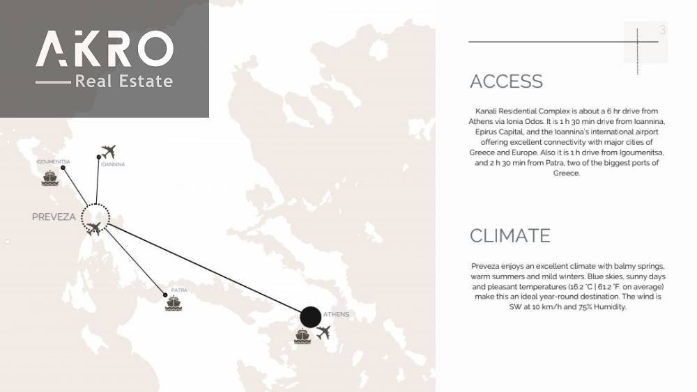 Location: The Ionian coastline is one of Greece’s best-kept secrets. By choosing Kanali as your base, you gain access to endless sandy beaches, beautiful natural landscapes, dramatic mountains, rivers, and charming seaside villages. Kanali is located 16 km from Aktion International Airport and 15 km from the town of Preveza, and lies along one of the longest beaches in Greece (approximately 23 km). The area offers supermarkets, bakeries, pastry shops, cafés, restaurants, pharmacies, medical facilities, and all essential services. Preveza, just 15 km away, is ideal for evening walks and entertainment, featuring a long seaside pedestrian zone and Marina Prevezas with hundreds of sailing boats, yachts, and vessels.