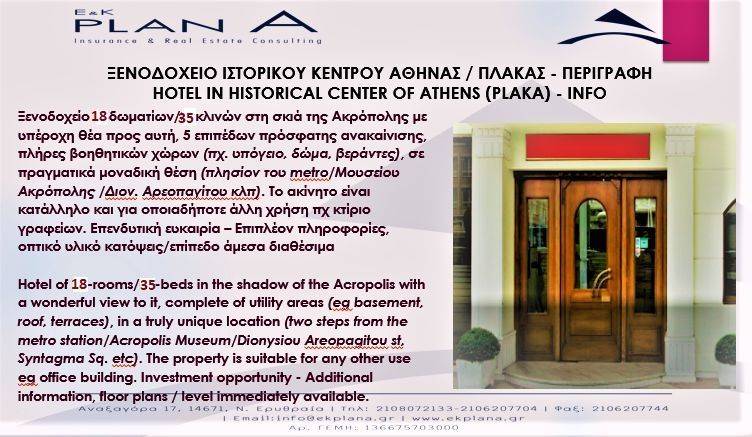 Αθήνα/Ιστορικό Κέντρο (στη σκιά του Ιερού Βράχου) – προς πώληση ξενοδοχείο 18 δωματίων - 34 κλινών (δυνατότητα δημιουργίας τουλάχιστον 20 δωματίων με αναδιάταξη των χώρων), 5 επιπέδων, άριστης κατάστασης, σύγχρονων υποδομών/εγκαταστάσεων, με υπέροχη θέα Ακρόπολη, πλησίον του metro και της πλειονότητας των αξιοθέατων του ιστορικού κέντρου (πχ. Μουσείο Ακρόπολης), κατάλληλο και για οποιαδήποτε άλλη χρήση πχ κτίριο γραφείων. Λοιπές πληροφορίες, οπτικό υλικό και κατόψεις/επίπεδο είναι άμεσα διαθέσιμα. Πραγματική επενδυτική ευκαιρία. Ε&Κ PLAN Α CONSULTING _ Tel.: +30/2108072133, +30/2106207704, +30/6937324626 ή +30/6945542347, (S0206 1), 10:00-18:00