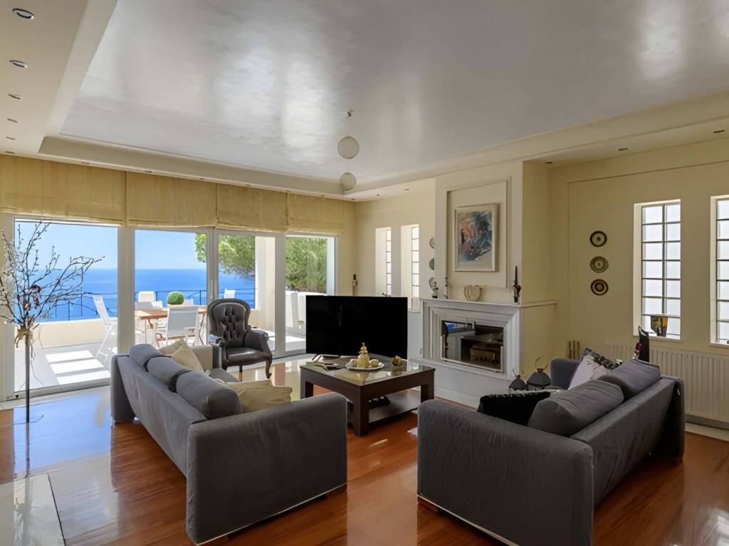 Sea View House for Sale South Athens, Agia Marina, Athens Riviera Total Area: 346 m² Plot Size: 494 m² Levels: 4 Year Built: 2000 Parking: Yes Elevator: Yes Location: Althea area, Agia Marina Property Overview A luxurious detached residence with unobstructed panoramic sea views, located in the highly sought-after Althea area of Agia Marina, just minutes from the beaches of the Athens Riviera. The property combines generous interior spaces, flexible layouts, and exceptional views, making it ideal as a permanent residence or a high-end coastal retreat. The house spans four levels, all connected by internal elevator and staircase, and is complemented by a fully independent guest house. Layout & Interior Spaces Ground Floor Elegant living and dining area with fireplace and expansive sea views Open-plan kitchen Guest WC Access to a large sea-view veranda with outdoor seating Two balconies First Floor Two bedrooms with private balconies One shared bathroom Bright and airy layout Attic Level One additional bedroom Balcony with open views Flexible use as bedroom, office, or lounge Lower Level (Semi-Basement) Spacious playroom / multipurpose area One bathroom Maid’s room Independent guest apartment with:
