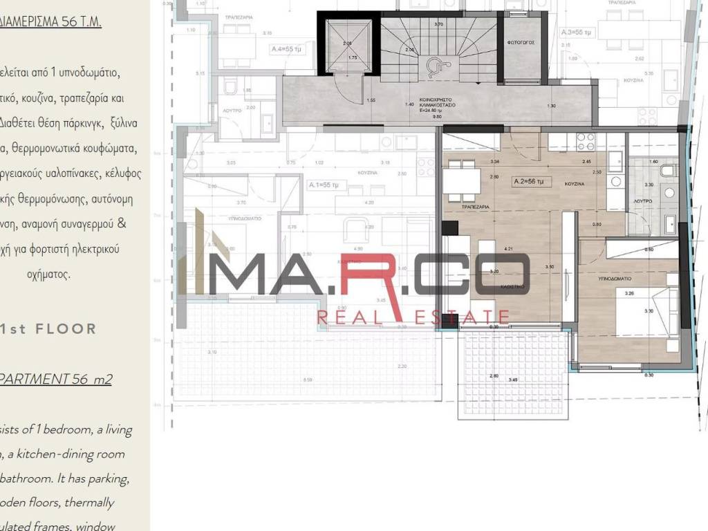 Apartment For sale, floor: 1st, in Kallithea - Lofos Filaretou. The Apartment is 55 sq.m.. It consists of: 1 bedrooms, 1 bathrooms and it also has 1 parkings (1 Pilotis space). The property was built in 2026. Its heating is Personal with Heat pump, Solar water system, Thermal insulation are also available, it has Alluminum, Thermal brake frames with Double glazed - Energy Efficient windows, the energy certificate is: A+ and its floors are Tiles, Wooden. The property's status is: New development, Under construction and it has Southeast orientation and it also has the following unique features and advantages: Window Screens, Elevator, Storage, Security door, CCTV, Security alarm. Price: €185.000. MA.R.CO REALESTATE & CONSTRUCTION, contact phone: 6944855335, 2109650870, email: info@marco-realestate.gr, website: