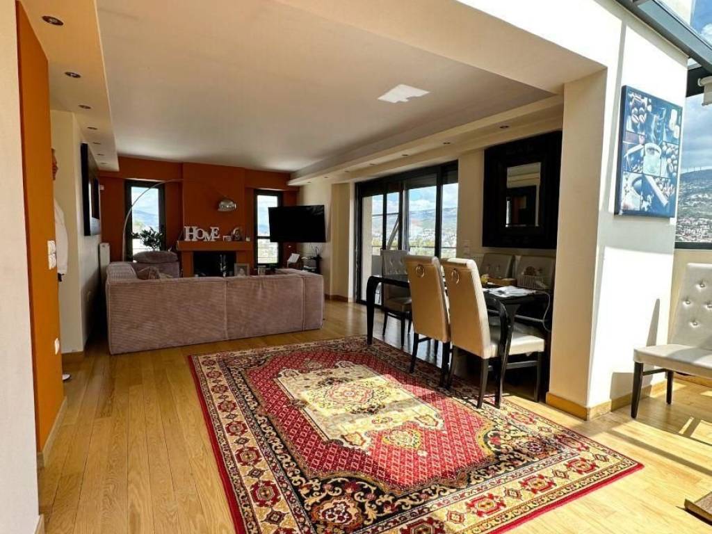 Modern Duplex apartment constructed in 2009 with a shared swimming pool. It is located in the area of Ano Vrilissia, bordering with Palea Penteli and is ideal for accessing Melissia, Marousi and Kifisia as well as all the international and private schools in the North Parts of Athens. The duplex is ideal for those who seek to enjoy the breath-taking view of the mountain and the city in a quiet and green environment and yet close to shopping facilities and transportation means. The apartment is 140sqm on the 3rd and 4th floor. It consists of a lovely living area with a fireplace, a dining area and semi-open plan kitchen equipped with top of the line appliances. The living area exits to a nice veranda with impressive view. On this level here is 1 master bedroom with 1 bathroom en-suite and 1 guest WC. On the upper level there are 2 more bedrooms sharing a bathroom. This level exits to a private roof garden with amazing panoramic view. Other amenities include autonomous heating with oil, underground parking for one car, storage, etc. For more information please contact our real estate agency or visit our web site at www.allaboutproperty.gr The real estate fee to our office, in the case of buying and selling the specific property, amounts to 2% (two percent) of the total real value of the main contract plus the statutory VAT (24%), or in the case of leasing the brokerage fee is equal to one month’s rent plus VAT (24%). When viewing properties, it is necessary to present a legal form of ID, as well as the A.F.M. (TAX number) of the interested buyer based on Law 4072/11.4.2012.
