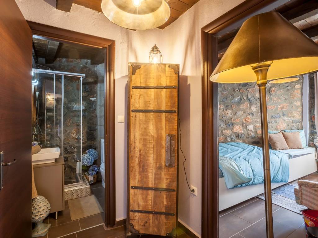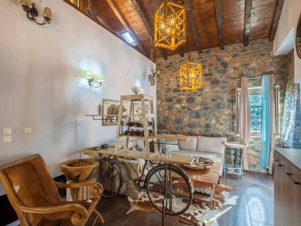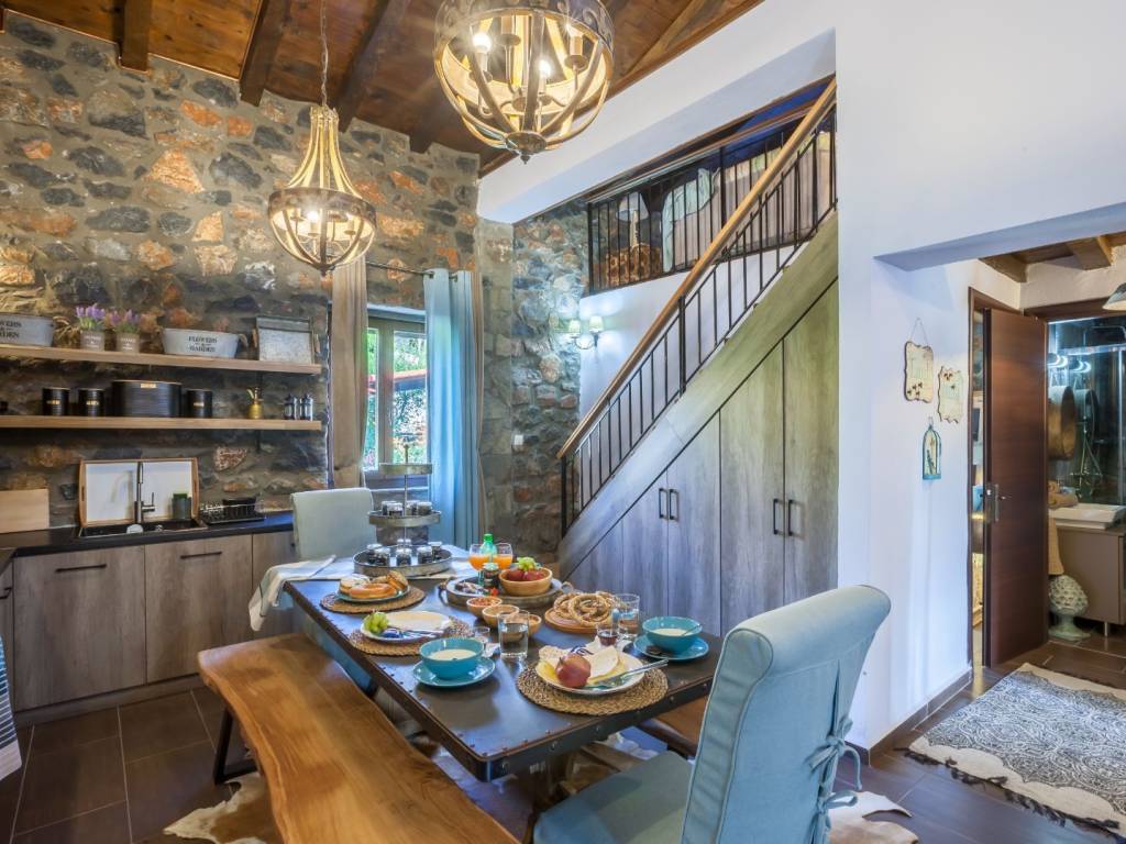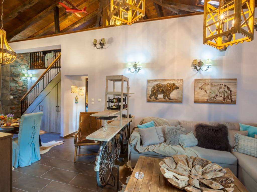 Attic. Το ισόγειο αποτελείται από ένα καθιστικό με τηλεόραση και τζάκι, μία πλήρως εξοπλισμένη κουζίνα, μια τραπεζαρία, μια κρεβατοκάμαρα με διπλό κρεβάτι, μια κρεβατοκάμαρα με ημίδιπλο κρεβάτι και ένα μπάνιο με ντουζιέρα. Μερικά σκαλιά μακριά και βρισκόμαστε στην υπέροχη σοφίτα με δύο διπλά κρεβάτια και ένα μικρό wc και πλυντήριο ρούχων. Η διακόσμηση είναι πολύ ιδιαίτερη καθώς το παλιό συναντά το νέο στοιχείο.
