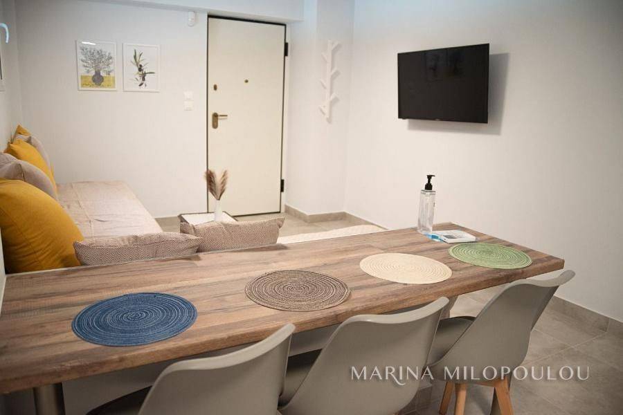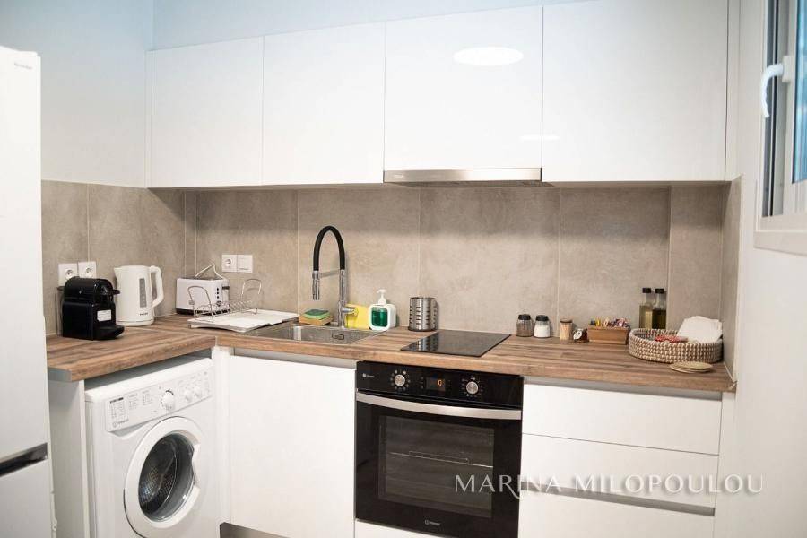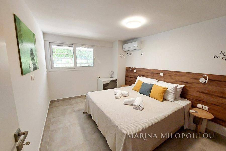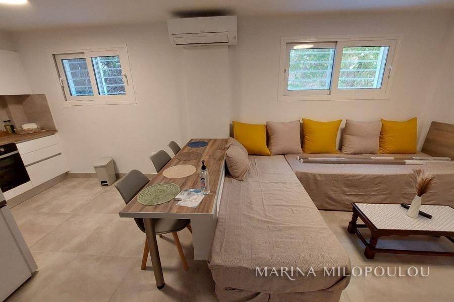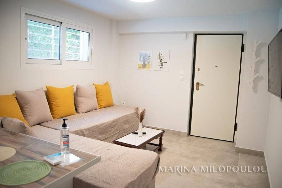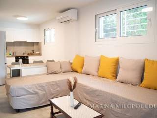 VARKIZA, Furnished semi-basement apartment, 48sqm, renovated and spacious, with a modern layout and exit to a small terrace and garde and private entrance. It consists of a living room - open plan, fully equipped kitchen, 1 bedroom with large wardrobe and bathroom. It features a security door, cooling-heating with A/Cs Inverter, double glazing, solar water heater, double bed 180 X 200, washing machine. No maintenance expenses. On a quiet street, 500m from the center of Varkiza, 650m from 'Varkiza Resort" beach.