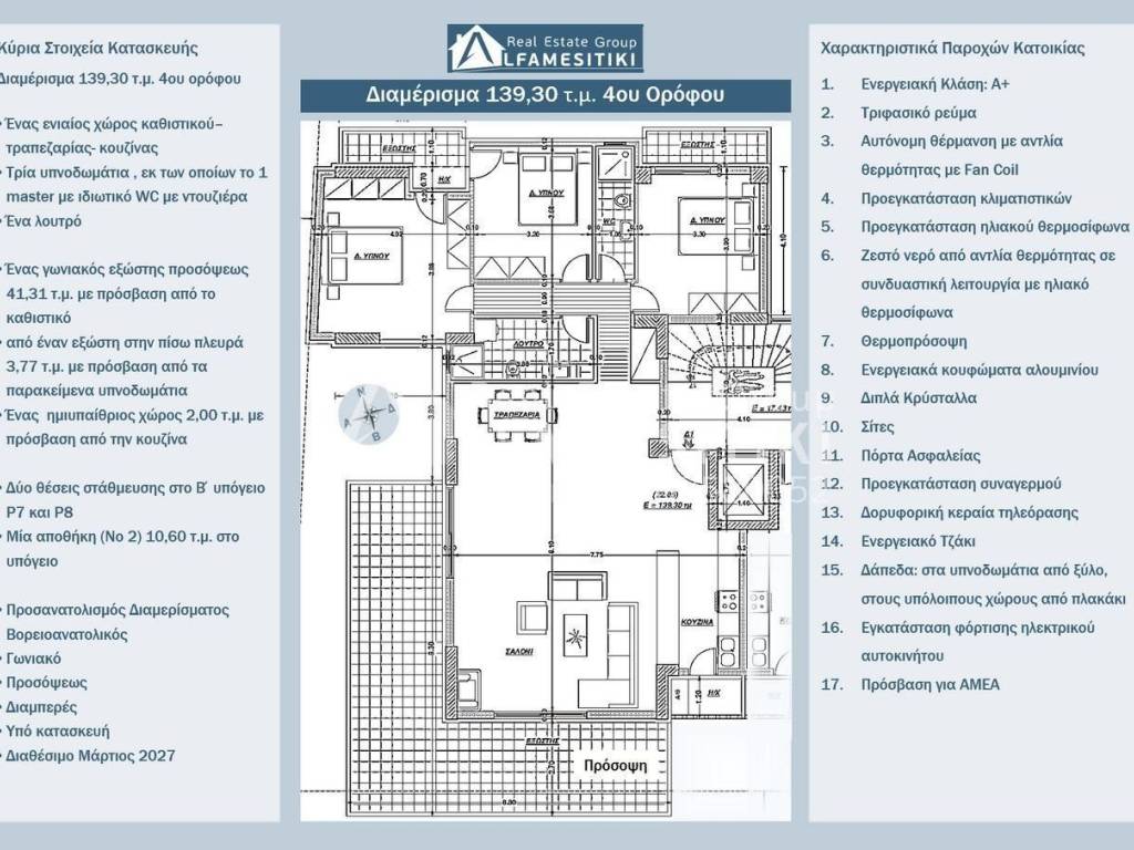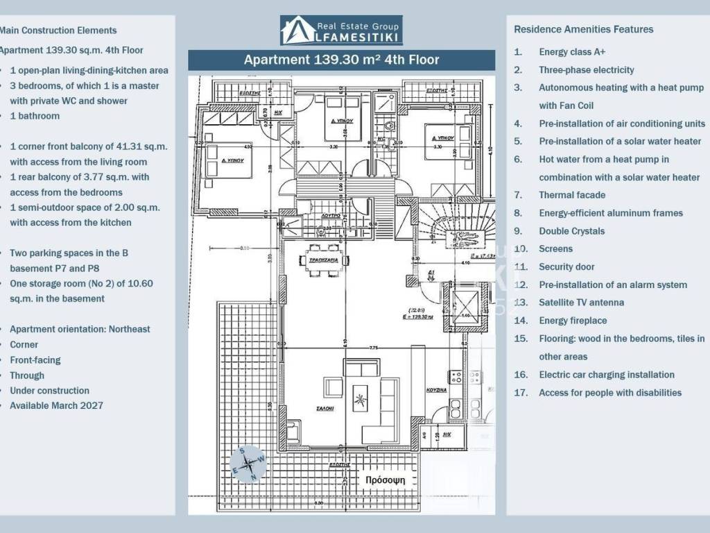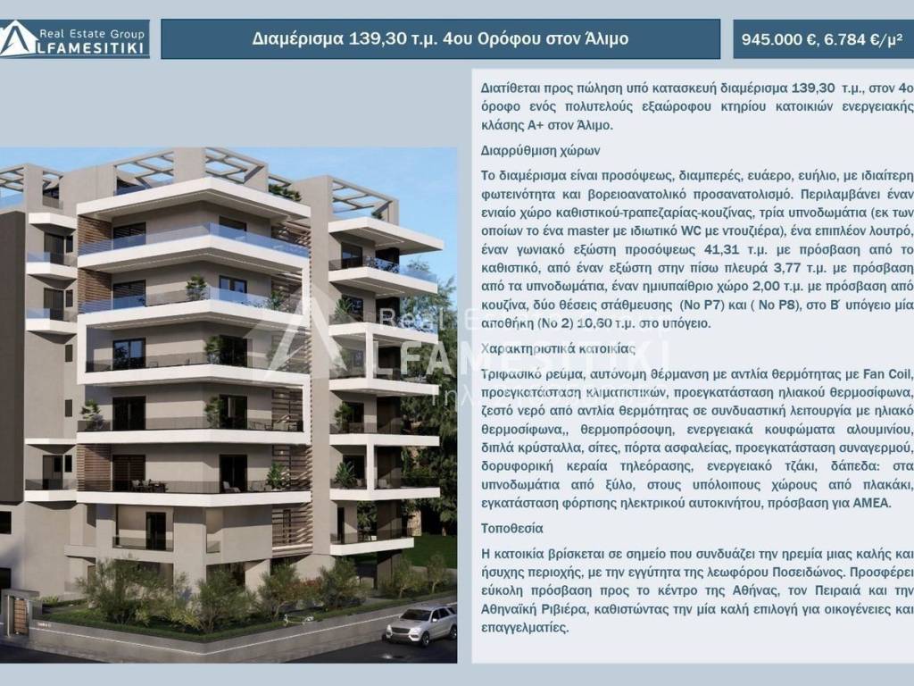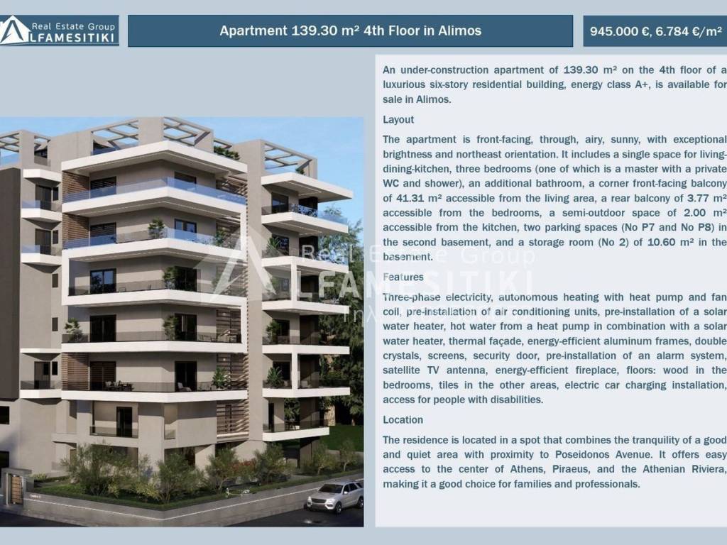 An under-construction apartment of 139.30 m² on the 4th floor of a luxurious six-story residential building, energy class A+, is available for sale in Alimos. Layout The apartment is front-facing, through, airy, sunny, with exceptional brightness and northeast orientation. It includes a single space for living-dining-kitchen, three bedrooms (one of which is a master with a private WC and shower), an additional bathroom, a corner front-facing balcony of 41.31 m² accessible from the living area, a rear balcony of 3.77 m² accessible from the bedrooms, a semi-outdoor space of 2.00 m² accessible from the kitchen, two parking spaces (No P7 and No P8) in the second basement, and a storage room (No 2) of 10.60 m² in the basement. Features Three-phase electricity, autonomous heating with heat pump and fan coil, pre-installation of air conditioning units, pre-installation of a solar water heater, hot water from a heat pump in combination with a solar water heater, thermal façade, energy-efficient aluminum frames, double crystals, screens, security door, pre-installation of an alarm system, satellite TV antenna, energy-efficient fireplace, floors: wood in the bedrooms, tiles in the other areas, electric car charging installation, access for people with disabilities. Location The residence is located in a spot that combines the tranquility of a good and quiet area with proximity to Poseidonos Avenue. It offers easy access to the center of Athens, Piraeus, and the Athenian Riviera, making it a good choice for families and professionals. ► For more details about the property, the building or the area as well as to visit the property you can visit the page - https://www.alfamesitiki.gr/pdetails?id=Α-146238&lng=en ► For opportunities in similar properties and in other areas visit our page at alfamesitiki.gr ► Last update 22/1/2026 ► Follow us on Facebook www.facebook.com/alfamesitiki.gr