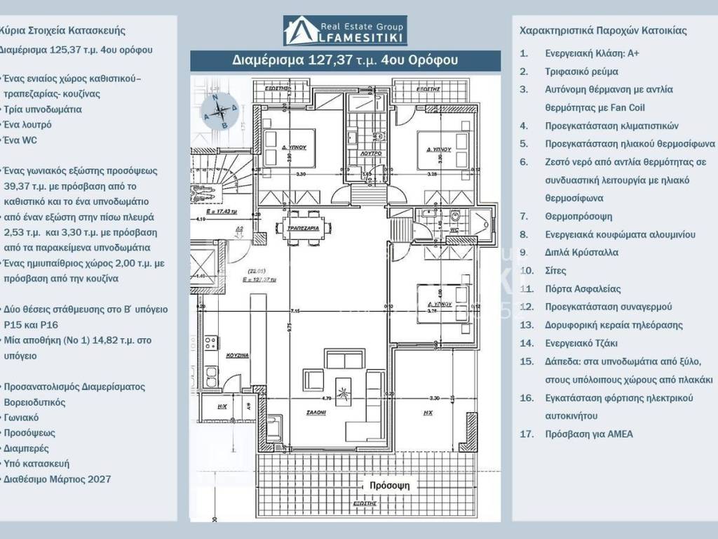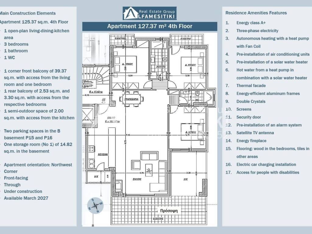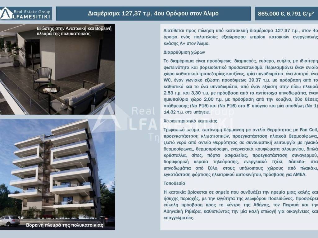 Available for sale, an under-construction apartment of 127.37 sq.m. on the 4th floor of a luxurious six-story residential building with energy class A+ in Alimos. Layout The apartment is front-facing, through, airy, sunny, with exceptional brightness and northwest orientation. It includes an open-plan living-dining-kitchen area, three bedrooms, one bathroom, one WC, a corner front balcony of 39.37 sq.m. with access from the living room and one bedroom, a rear balcony of 2.53 sq.m. and 3.30 sq.m. with access from the respective bedrooms, a semi-outdoor space of 2.00 sq.m. with access from the kitchen, two parking spaces (No P15 and No P16) in the B basement, and one storage room (No 1) of 14.82 sq.m. in the basement. Residence Features Three-phase electricity, autonomous heating with heat pump and fan coil, pre-installation of air conditioning units, pre-installation of a solar water heater, hot water from a heat pump in combination with a solar water heater, thermal façade, energy-efficient aluminum frames, double crystals, screens, security door, pre-installation of an alarm system, satellite TV antenna, energy-efficient fireplace, floors: wood in the bedrooms, tiles in the other areas, electric car charging installation, access for people with disabilities. Location The residence is located in an area that combines the tranquility of a good and quiet neighborhood with the proximity to Poseidonos Avenue. It offers easy access to the center of Athens, Piraeus, and the Athenian Riviera, making it an excellent choice for families and professionals. ► For more details about the property, the building or the area as well as to visit the property you can visit the page - https://www.alfamesitiki.gr/pdetails?id=Α-146236&lng=en ► For opportunities in similar properties and in other areas visit our page at alfamesitiki.gr ► Last update 22/1/2026 ► Follow us on Facebook www.facebook.com/alfamesitiki.gr