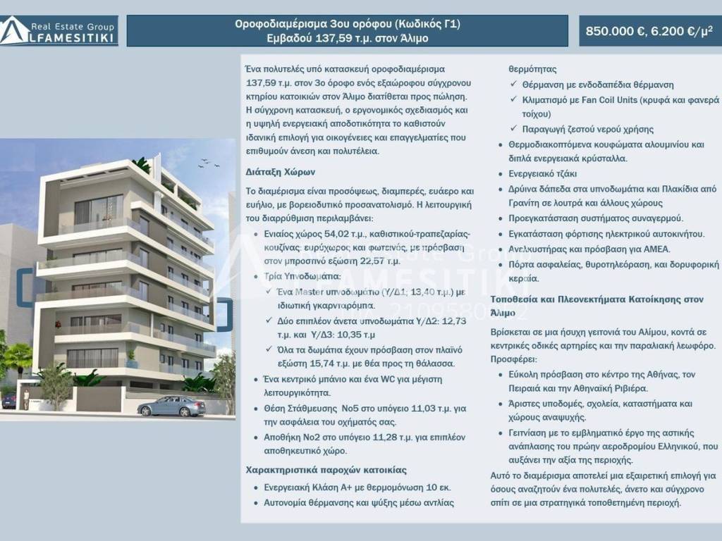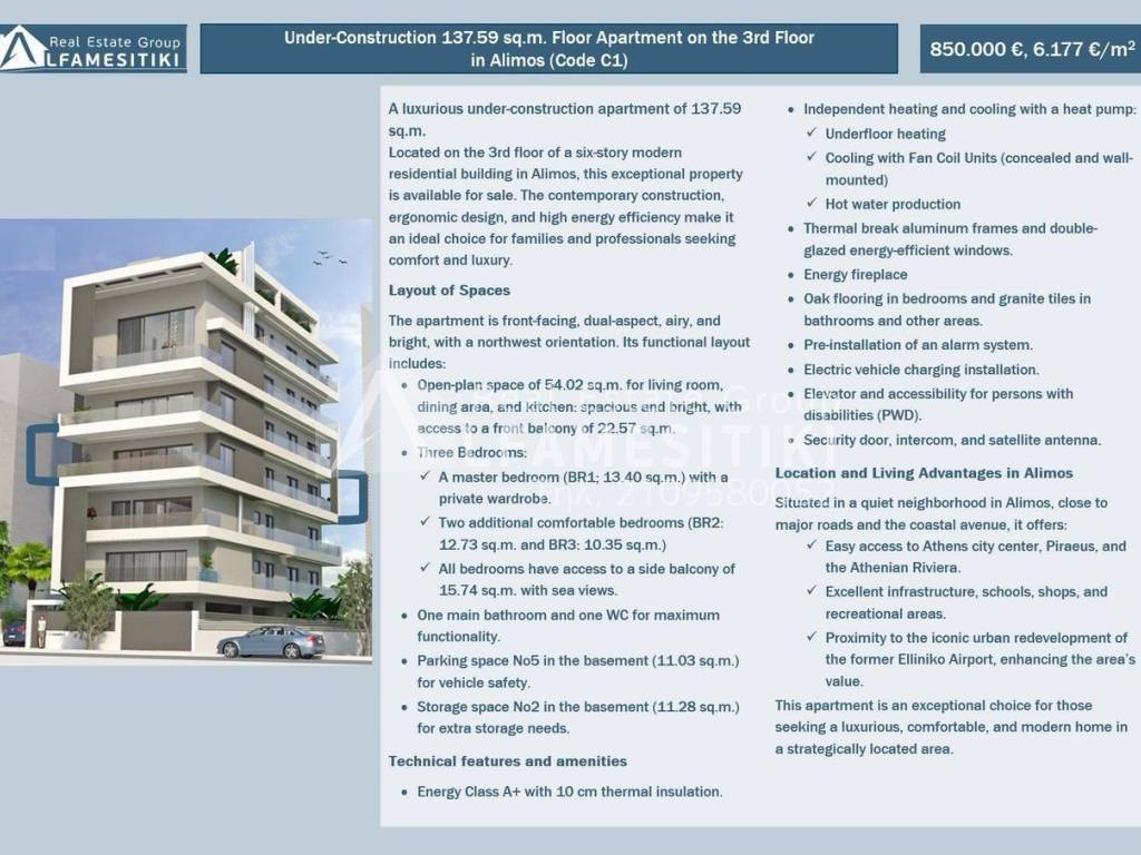 Located on the 3rd floor of a six-story modern residential building in Alimos, this exceptional property is available for sale. The contemporary construction, ergonomic design, and high energy efficiency make it an ideal choice for families and professionals seeking comfort and luxury. Layout of Spaces The apartment is front-facing, dual-aspect, airy, and bright, with a northwest orientation. Its functional layout includes: Open-plan space of 54.02 sq.m. for living room, dining area, and kitchen: spacious and bright, with access to a front balcony of 22.57 sq.m. Three Bedrooms: A master bedroom (BR1; 13.40 sq.m.) with a private wardrobe. Two additional comfortable bedrooms (BR2: 12.73 sq.m. and BR3: 10.35 sq.m.) All bedrooms have access to a side balcony of 15.74 sq.m. with sea views. One main bathroom and one WC for maximum functionality. Parking space No5 in the basement (11.03 sq.m.) for vehicle safety. Storage space No2 in the basement (11.28 sq.m.) for extra storage needs. Technical features and amenities Energy Class A+ with 10 cm thermal insulation. Independent heating and cooling with a heat pump: Underfloor heating Cooling with Fan Coil Units (concealed and wall-mounted) Hot water production Thermal break aluminum frames and double-glazed energy-efficient windows. Energy fireplace Oak flooring in bedrooms and granite tiles in bathrooms and other areas. Pre-installation of an alarm system. Electric vehicle charging installation. Elevator and accessibility for persons with disabilities (PWD). Security door, intercom, and satellite antenna. Location and Living Advantages in Alimos Situated in a quiet neighborhood in Alimos, close to major roads and the coastal avenue, it offers: Easy access to Athens city center, Piraeus, and the Athenian Riviera. Excellent infrastructure, schools, shops, and recreational areas. Proximity to the iconic urban redevelopment of the former Elliniko Airport, enhancing the area’s value. This apartment is an exceptional choice for those seeking a luxurious, comfortable, and modern home in a strategically located area. ► For more details about the property, the building or the area as well as to visit the property you can visit the page - https://www.alfamesitiki.gr/pdetails?id=Α-146235&lng=en ► For opportunities in similar properties and in other areas visit our page at alfamesitiki.gr ► Last update 22/1/2026 ► Follow us on Facebook www.facebook.com/alfamesitiki.gr