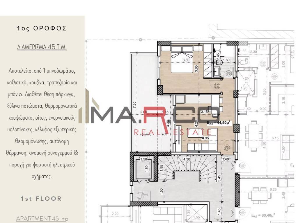 Apartment For sale, floor: 1st, in Marousi - O.A.K.A.. The Apartment is 45 sq.m.. It consists of: 1 bedrooms, 1 bathrooms and it also has 1 parkings (1 Pilotis space). Its heating is Personal with Heat pump, Solar water system, Sound insulation, Thermal insulation are also available, it has Alluminum, Thermal brake frames with Double glazed - Energy Efficient windows, the energy certificate is: A and its floors are Tiles, Wooden. The property's status is: Under construction, it is close to Transportation and it also has the following unique features and advantages: Window Screens, Elevator, Storage, Security door, CCTV, Security alarm. Price: €205.000. MA.R.CO REALESTATE & CONSTRUCTION, contact phone: 6944855335, 2109650870, email: info@marco-realestate.gr, website: