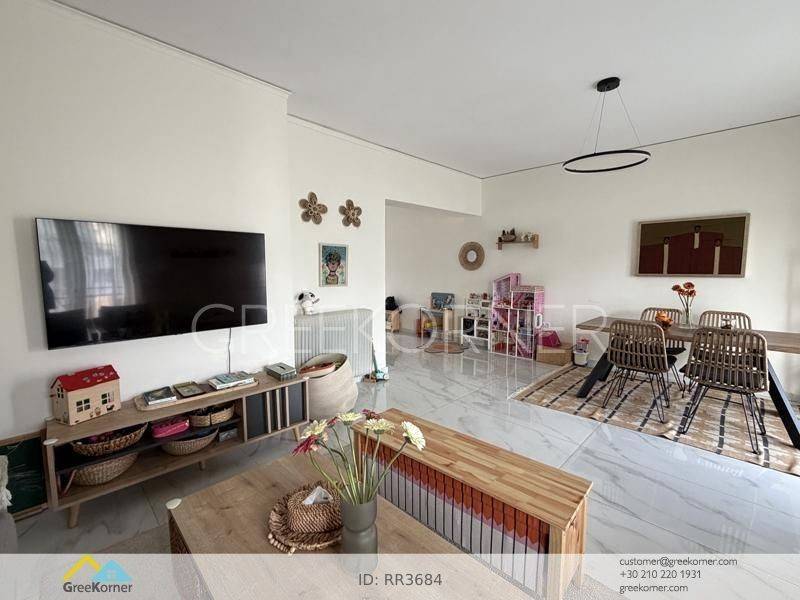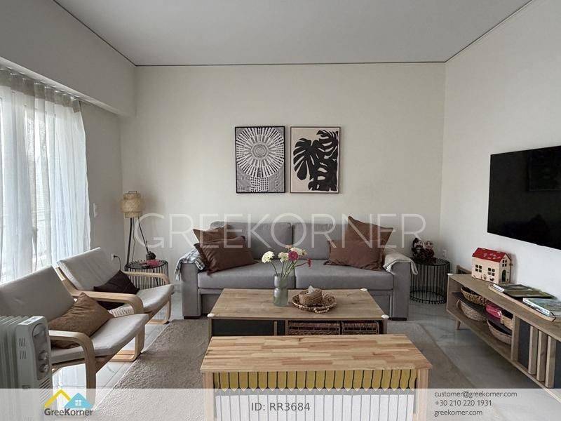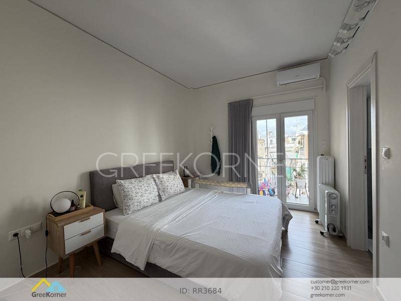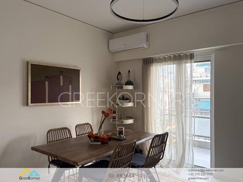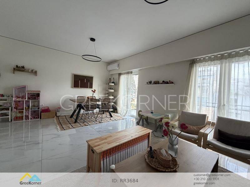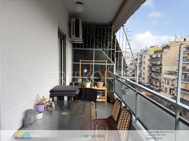 Pangrati, Centre - Apartment 120sqm fully furnished, bedrooms 3, levels 1, 5th, renovated, year built 1974, renovation year 2022, energy class B, living room, hall, kitchen, 2 bathrooms, heating type: central (natural gas), air condition, dual aspect apartment, luminous, unobstructed view view, painted, electric roller shutters, balconies, balcony 15sqm, tents, elevator, built in appliances, aluminum frames, double glazed windows, door screen, wood & tile floors, secure door, alarm, video doorbell, internet, residential zone, access from asphalt, close to park (up to 200m), close to metro/train (up to 1000m).