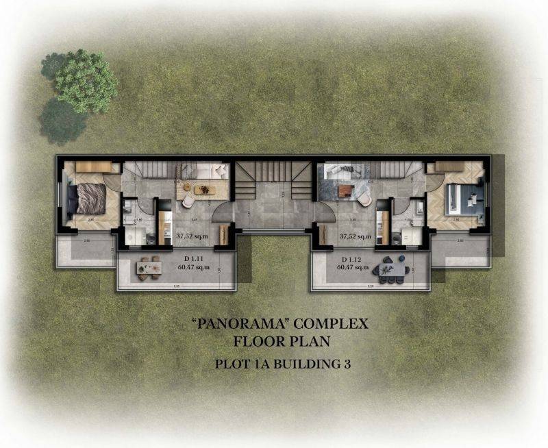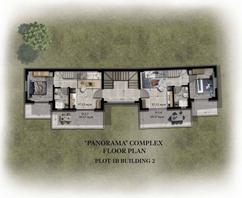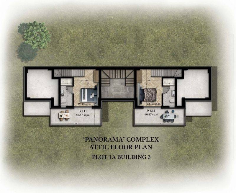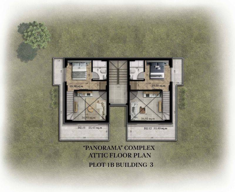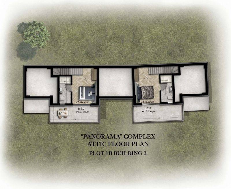 • 16 Διαμερίσματα ορόφου με σοφίτα από 55,45τ.μ έως 60,45τ.μ, που αποτελούνται από σαλοκουζίνα, 2 υπνοδωμάτια και 2 μπάνια.