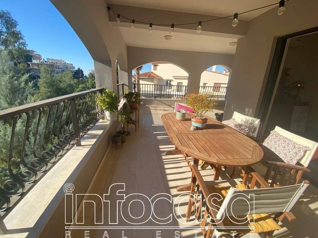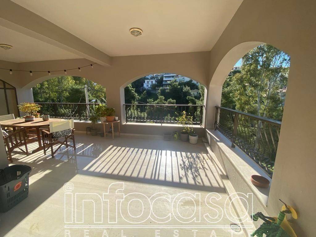 Panorama, in a very beautiful and quiet spot in the green, renovated apartment of 110 sq.m., 2nd floor. It consists of a very large living room-dining room and office, spacious separate kitchen, 2 comfortable bedrooms, bathroom and WC with shower. It has autonomous heating with natural gas, air conditioners, aluminum frames with double glazing and safety irons, alarm, security door and modern electrical appliances (electric stove, refrigerator, dishwasher and washing machine). It has very large terraces overlooking the green. Its special feature is that because the ground is sloping, at the back it has exclusive use of the garden. Contact person Evi Grouits +30 6945672292 & 210 7255 653, email: info2@infocasa.gr