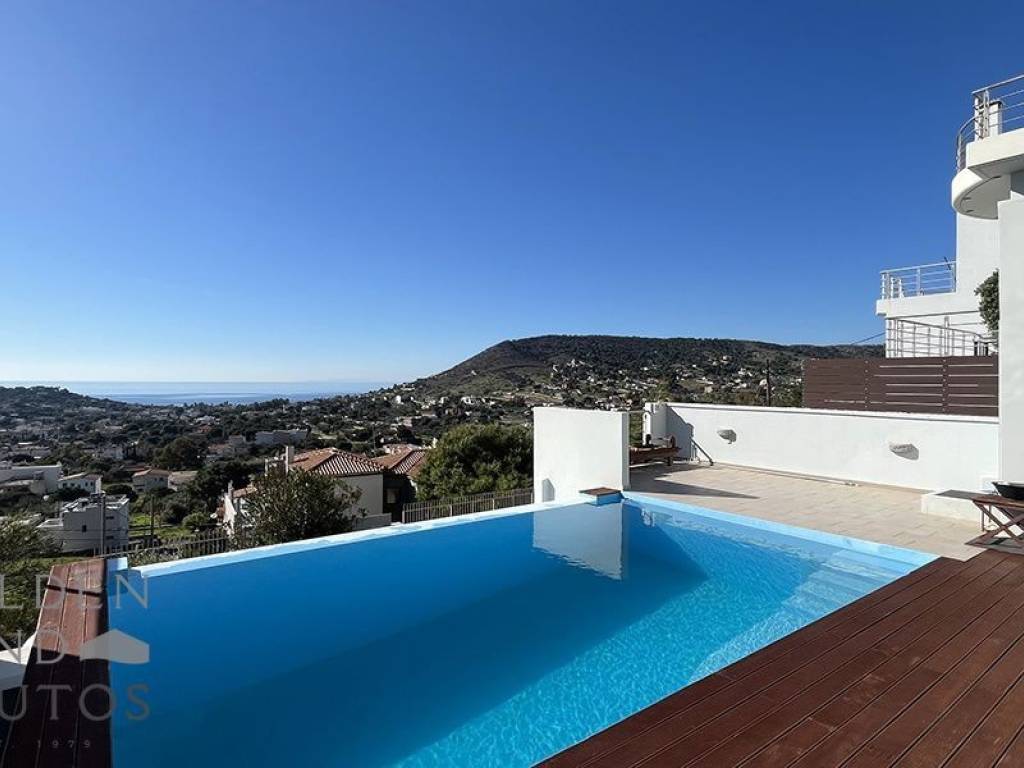 Agia Marina, an impressive residence built in 2010, set on a 350 sq.m. plot with a total built area of 242 sq.m., located just 1.5 km from the sea and offering breathtaking, unobstructed sea views. The property is arranged over 3 levels and stands out for its excellent construction quality and smart, functional layout. At street level there is a private garage, while an elevator serves all floors, providing access up to the pool living area. The first level features the pool with deck, a comfortable sitting area with kitchen, a shower bathroom, and a boiler room currently used as a storage and laundry room. The second level hosts the main living room with fireplace, the primary kitchen, and a guest WC, creating an ideal space for everyday living and entertaining. On the third level there are three bedrooms, including a master loft-style bedroom, as well as one additional bathroom. This is a high-standard property that perfectly combines comfort, privacy, and stunning views, making it ideal as a permanent residence, a holiday home, or an investment opportunity.