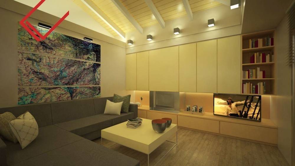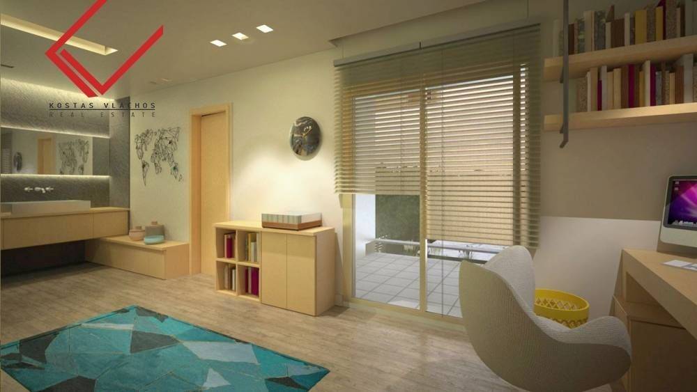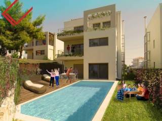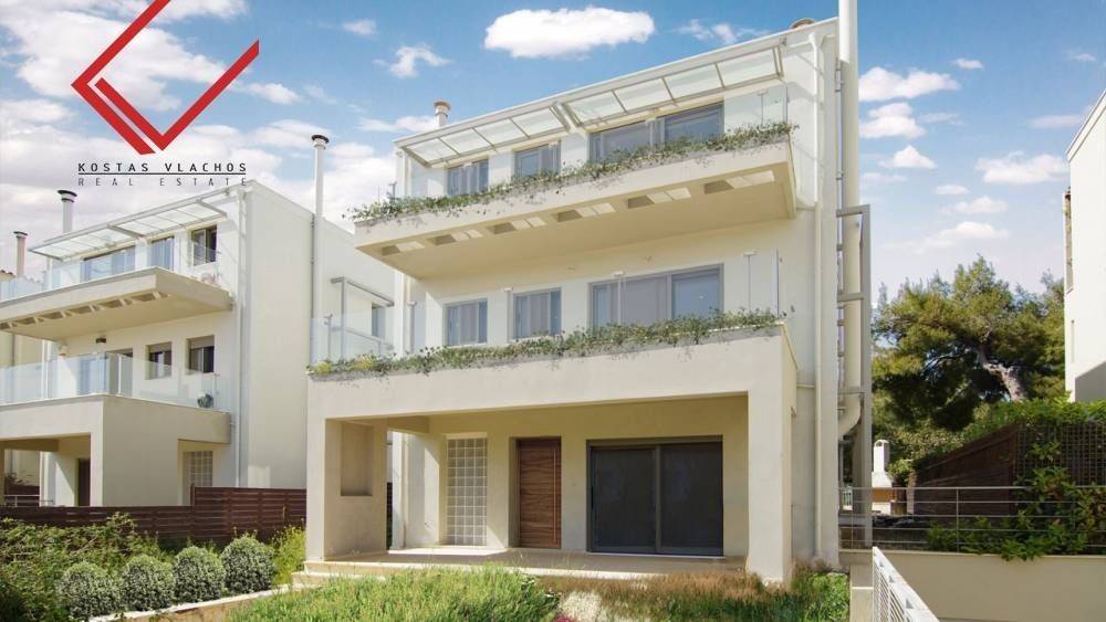 Each level covers 97 sq.m., while the balconies extend to 45 sq.m. The residence is equipped with an internal elevator, central cooling–heating system, energy-efficient fireplaces on every level, swimming pool, garden, storage room and two underground parking spaces.