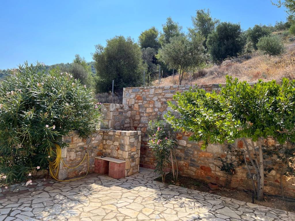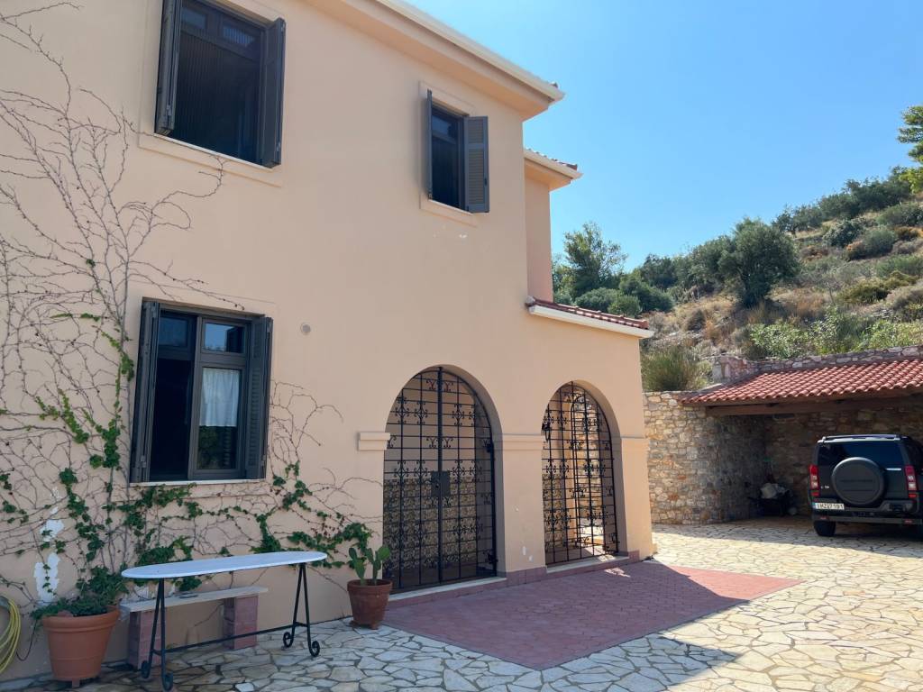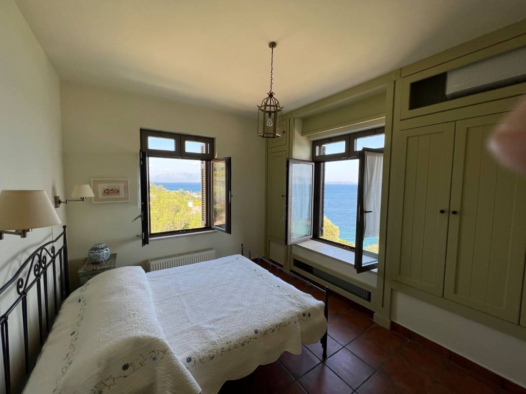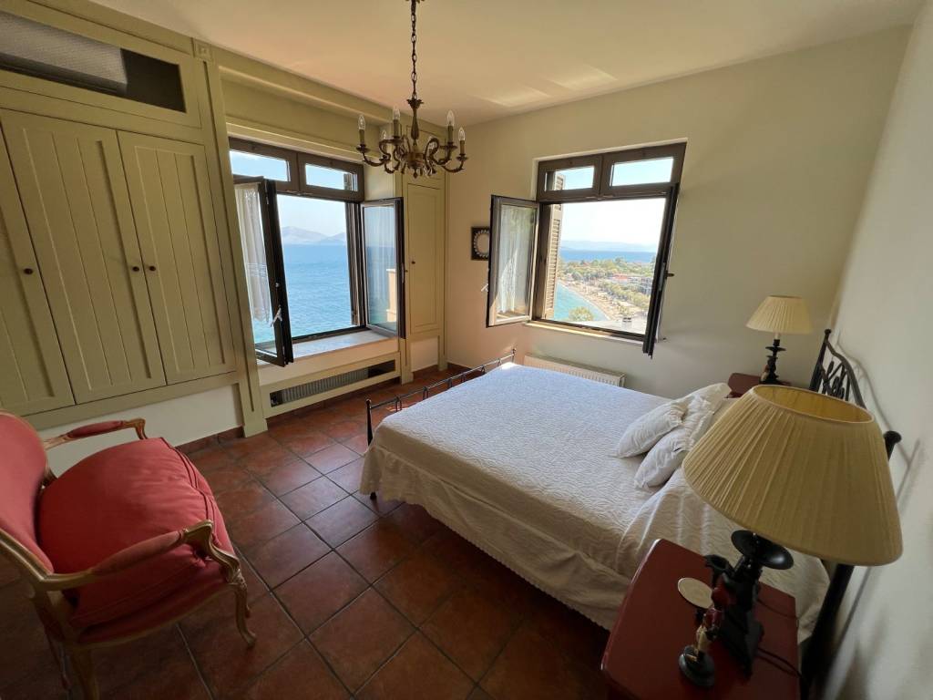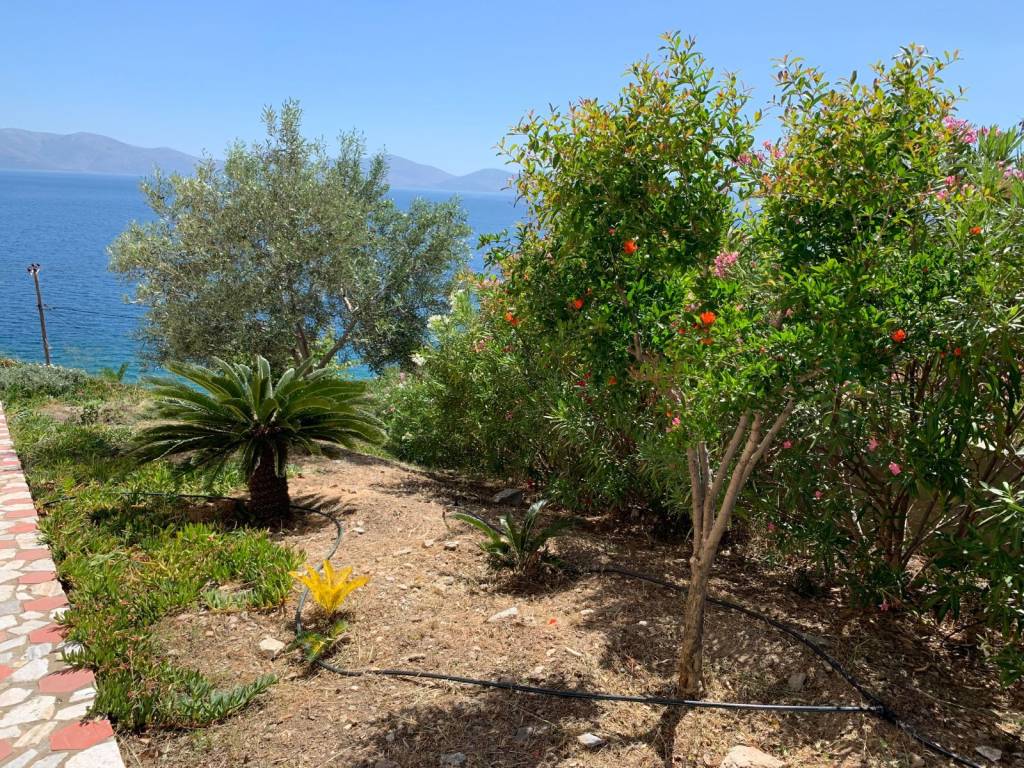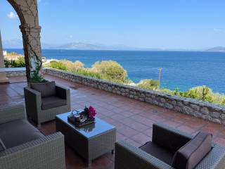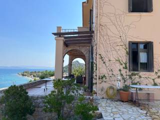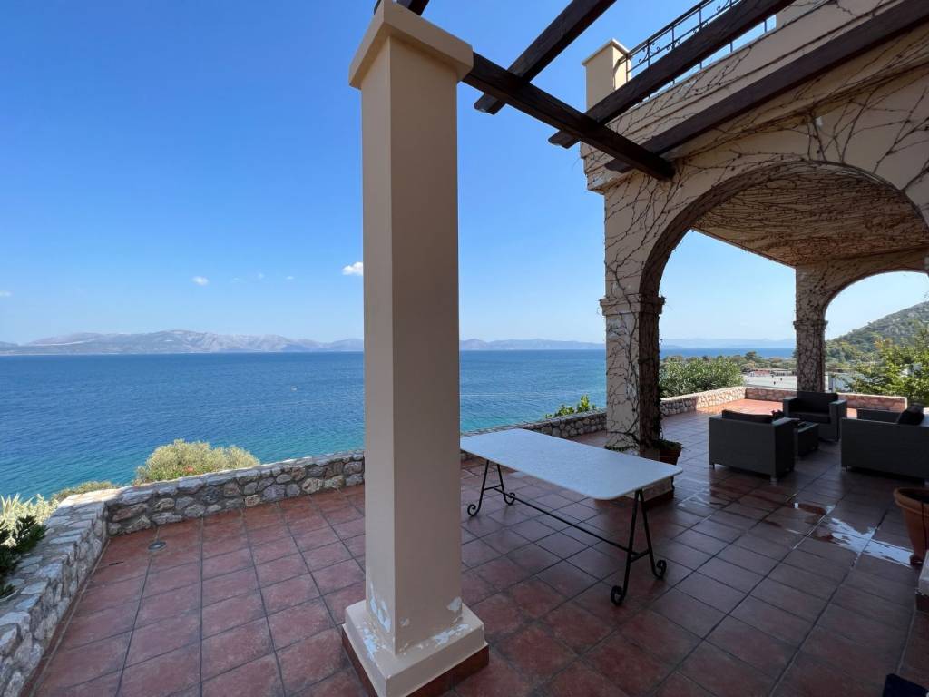 Luxury villa, 30 m from the sea, with outstanding panoramic views. In a plot of 2,200 sqm of mature garden.. The house has 5 bedrooms and five bathrooms. Finished to a very high standard. Close to Athens international airport. The property was built in 2012, over 3 floors (basement, ground and first floor). It has extensive outside space including a raised veranda from the garden and a first floor balcony, all with sea views. Ground flor includes a fully fitted kitchen with hand made and painted cabinets, spacious drawing room and dining room, with energy efficient fireplace, bedroom and bathroom. Stairs leading to first floor and basement, with natural limestone. First floor; sitting room with access to first floor balcony, master bedroom with en-suite bathroom and walk-in wardrobe, two further double bedrooms with bathrooms Basement; bedroom and bathroom, laundry room spacious storage rooms All wardrobes, cabinets and doors are hand made in wood and hand painted with special effect. All flooring from Italian terracotta. Double glazed aluminium windows with security locks and shutters. Bedrooms have air-conditioning. Central heating with oil-fired boiler. Solar water panels. Tiled roof and ample loft space. Alarm and security cameras inside building and outside that records movement Double garage space, covered with tiles. Outside shower with hot and cold water and a mature landscaped garden.