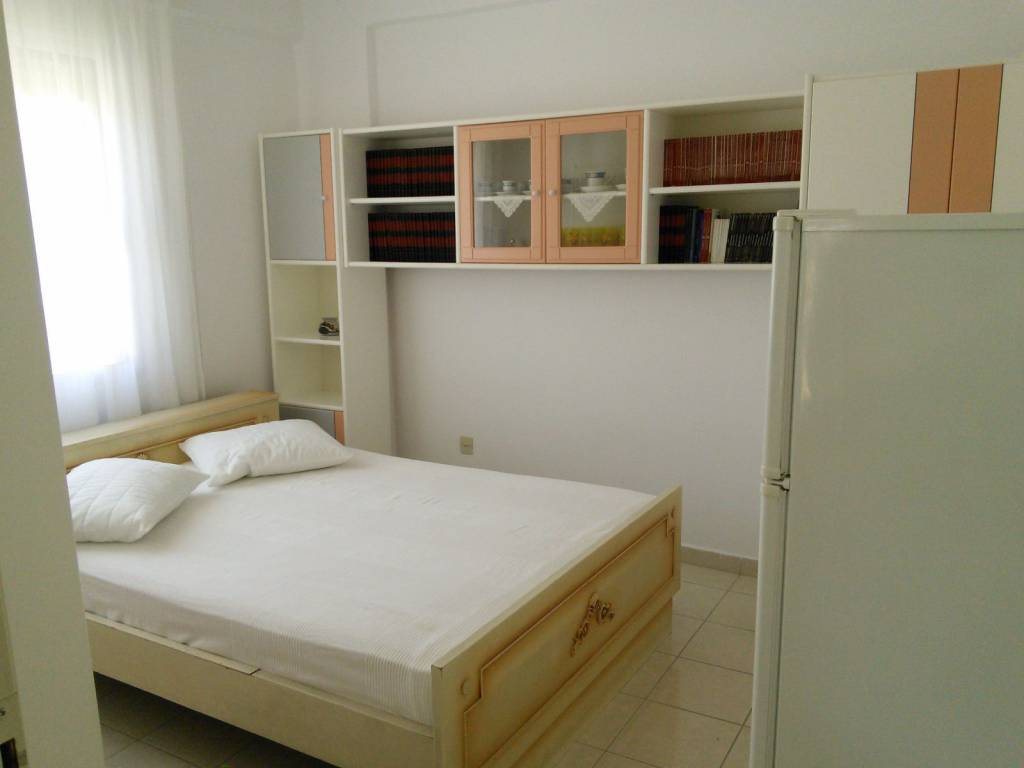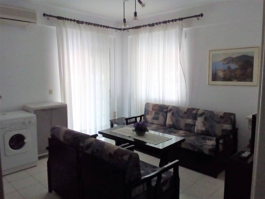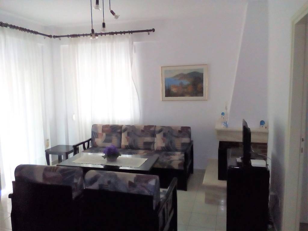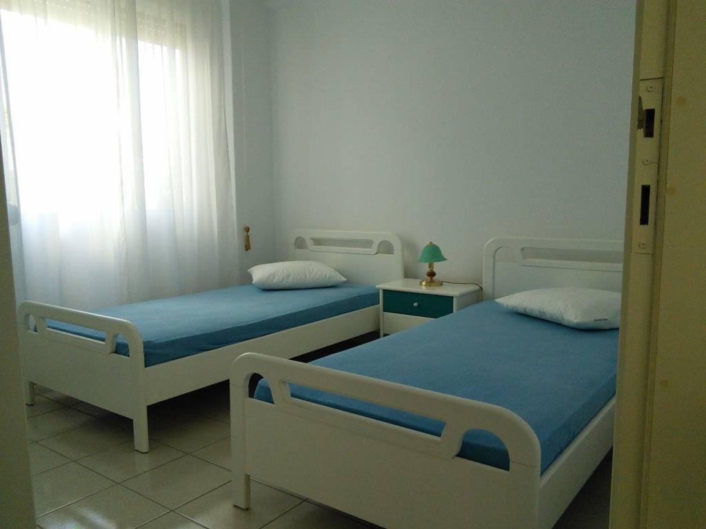 Flogita Beach, 200 meters from the sea. Summer Holiday Home Fully furnished corner apartment, 1st floor, 45 sq.m., near supermarkets, town center, ideal for couples with or without children. 2 Bedrooms: 1 double bed and 2 single beds. Living Room and kitchen : refrigerator, electric stove, washing machine, and air conditioning (A/C). 1 Bathroom: shower, water heater. mosquito nets, awnings, and spacious balcony. Price for SUMMER SEASON (June 1st to September 30th): Available upon request / depending on duration.