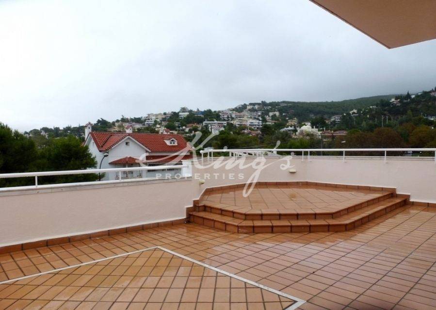 KIFISSIA- POLITIA, for sale, maisonette of 260sqm, with communal swimming pool, penthouse, 2 levels, on the 2nd floor large reception areas with fireplace, dining room, wooden flooring everywhere, large separate kitchen with daily seating area, 3 bedrooms (one of which master), jacuzzi, wc, very large terrace with view of the mountain, in the loft area two large spaces, tiles flooring, kitchenette, wc, access to roof garden 200sqm with bbq, kitchenette, bathroom and very nice view. There is an outdoor independent studio with bathroom and kitchenette. Autonomous heating system, boiler, air condition, alarm system, double glazed windows, elevator, storage 10sqm, parking for 3 cars (two of which in the basement), KING`S PROPERTIES - www.kingsproperties.gr - tel: +30210 8014300