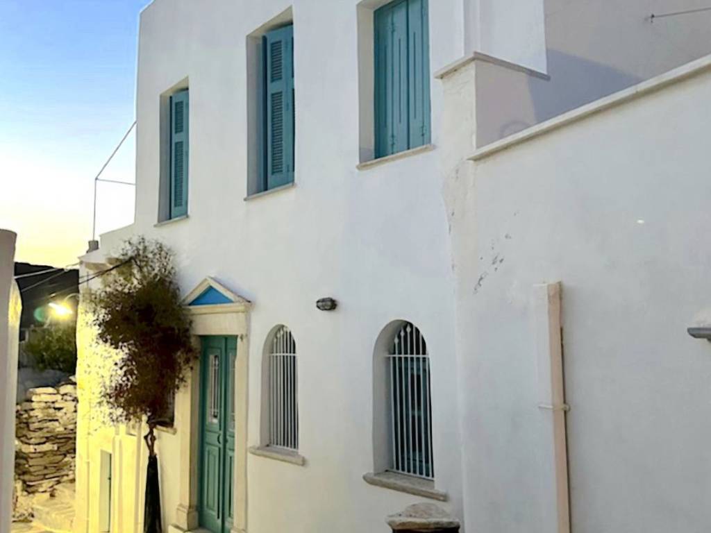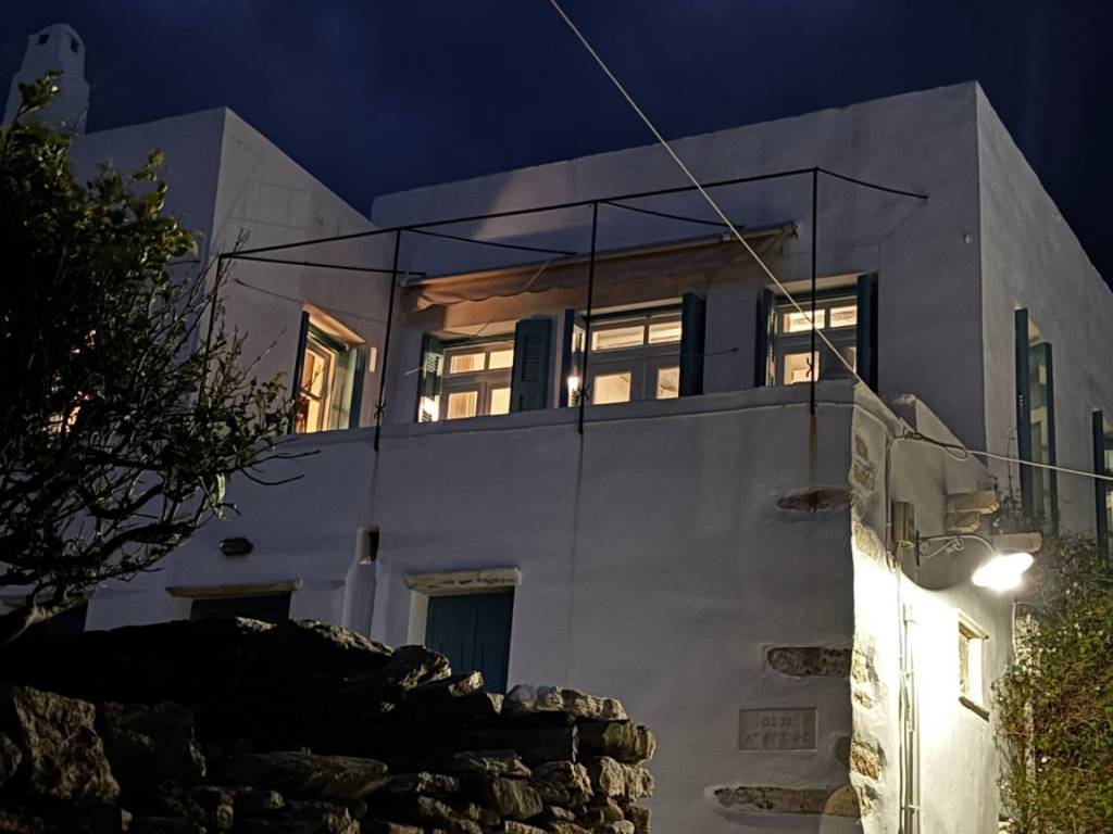 In the village of Pyrgos, Tinos, this historic residence dates back to 1836 and was built in two stages, displaying two distinct façades: a village-style façade on the northwest side and a more classical façade on the southwest side. Its ornate details subtly indicate that it was once owned by wealthy Pyrgiotes and constructed to last.