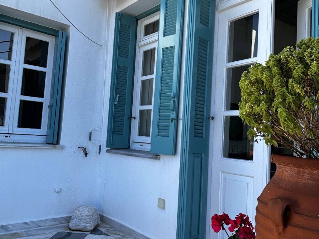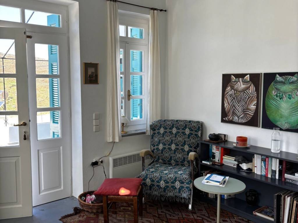 Pyrgos—meaning “tower” in Greek—is the largest village on Tinos and one of its most charming places to explore. The property is accessible via the village's charming streets—yet it remains less than 50 metres from the Pyrgos–Panormos main road.  Daily essentials, including the supermarket and bakery, are within walking distance, and the property can also be accessed from the church of Agia Foteini, making it easy to handle goods without climbing any stairs.