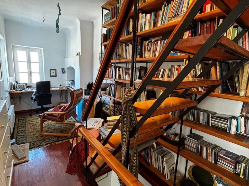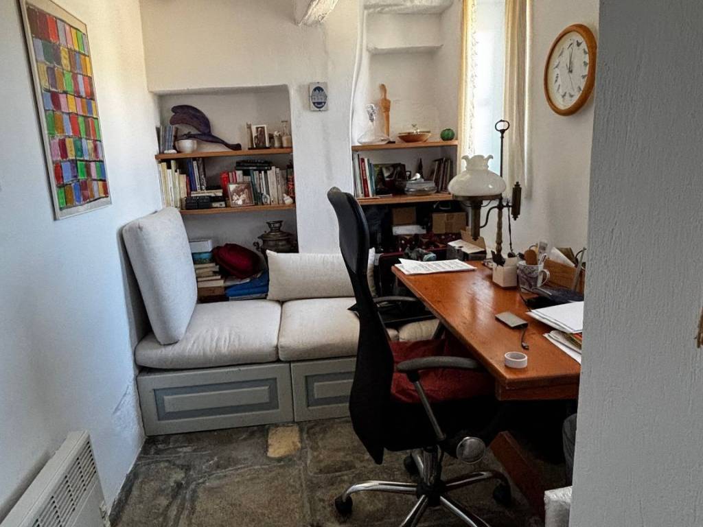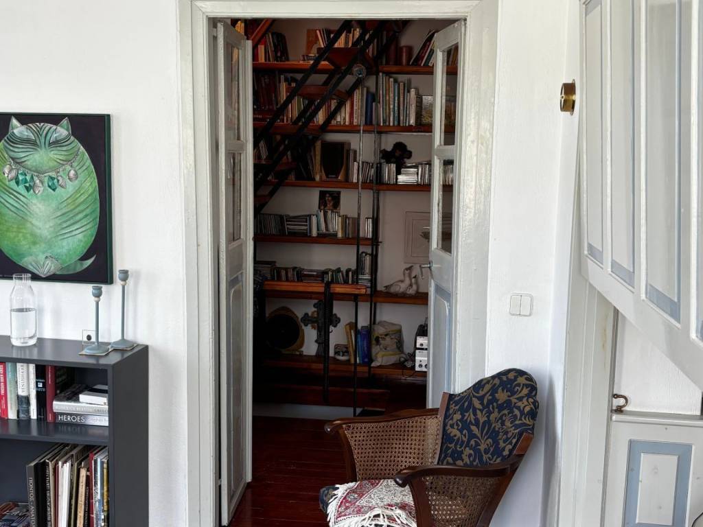 Practicality matches the atmosphere: the home offers approximately 120 sqm and is fully furnished. The main bedroom is on the first floor, with an additional ground-floor room that was previously used as a home office and can be used solely as a bedroom, depending on your preferences. There is also a sleeping alcove with a built-in bed. The home is completed by an equipped kitchen, two bathrooms, and a first-floor office with stairs leading to the roof. A wood-burning stove and electric heating panels throughout ensure it remains cosy in winter, while the engraved marble bathroom feels like an heirloom.