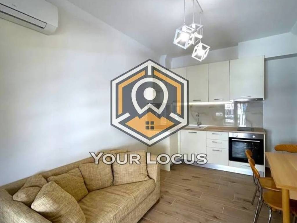 It consists of 1 bedroom, an open-plan living room with kitchen, and a bathroom. Built in 1970, it is offered with electrical appliances and basic furniture (wardrobe, sofa, kitchen table, built-in oven, washing machine). It features aluminum window frames with double glazing, security door, energy class B, and awnings.