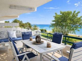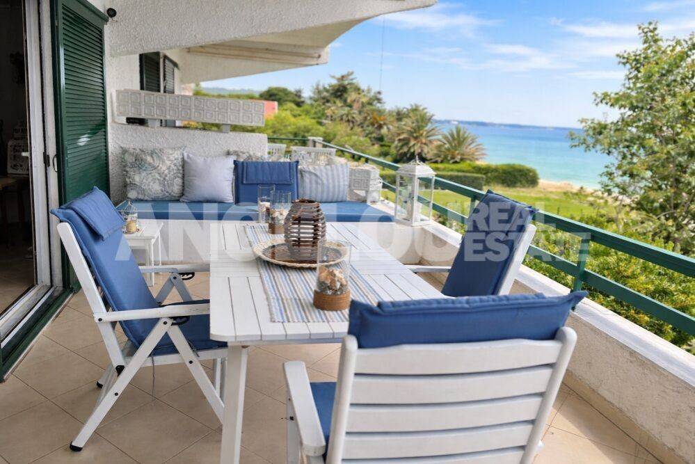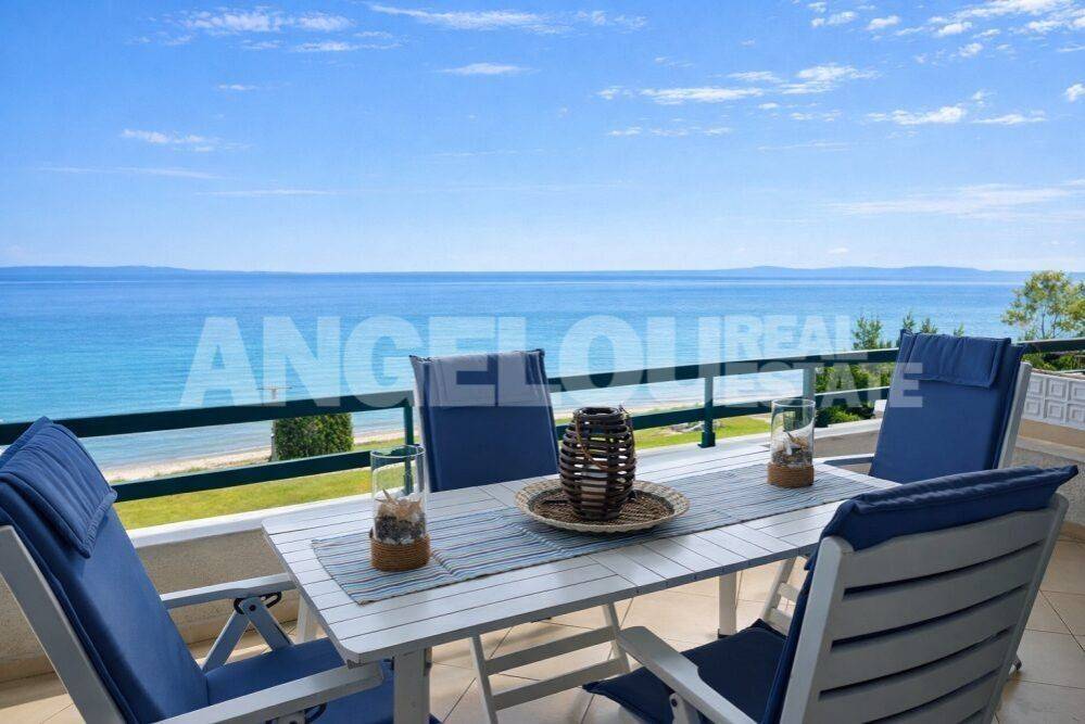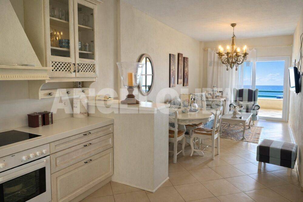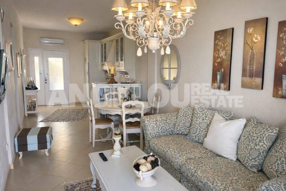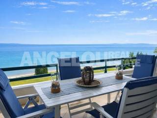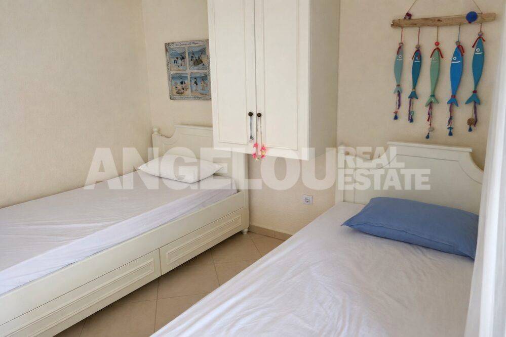Halkidiki, Polychrono. Beautiful 80 square meters apartment with an amazing sea view for rent. The dual aspect apartment is located on the first floor of the building. It consists of a large living room/kitchen, two spacious bedrooms with wardrobes and a bathroom with a shower. It can accommodate up to five guests. It has two large terraces with amazing sea and mountain views. The apartment is fully renovated, fully furnished and equipped with all the electrical appliances. It is located within a complex of apartments built on a seafront property. It has large areas of grass, trees and flowers as well as a private parking area. It is very close to the village. Rental rates: June: