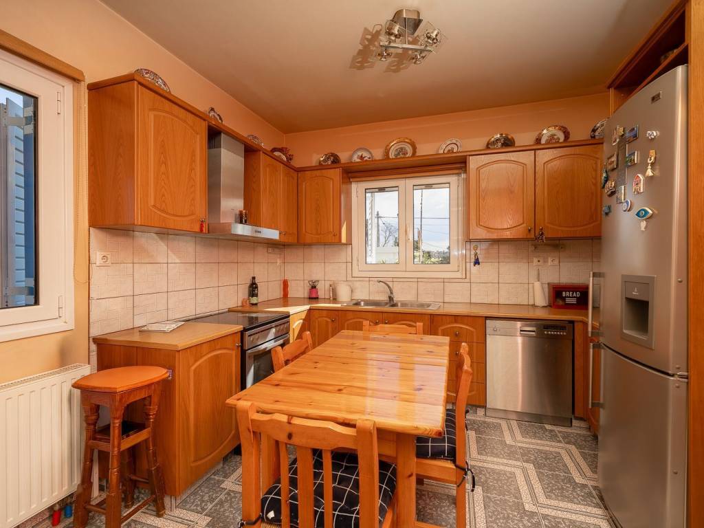 A 147 sq.m. maisonette is available for rent in Porto Rafti, in the Avlaki area, located in a quiet neighborhood with beautiful sea and mountain views. The property was built in 2002 and is situated just 400 meters from the sea. The residence consists of comfortable bedrooms, a spacious and bright living room, a separate kitchen, 1 bathroom, and 1 WC. It features tile flooring, aluminum window frames with insect screens, and a security alarm system. The property is offered fully furnished. Its equipment includes heating with a heat pump, air conditioning, a solar water heater, and a boiler, ensuring comfort and energy efficiency throughout the year. The outdoor area features a yard with a garden, a covered BBQ area ideal for relaxing and entertaining guests, as well as an open parking space. The location is particularly convenient, as it is 500 meters from a bus stop, 1.5 km from the town center and shops, while the airport is only 15 minutes away. An ideal choice for a permanent residence or a holiday home in a beautiful area close to the sea.