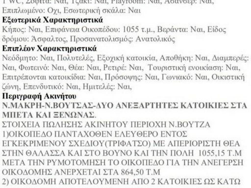 Προς πώληση στη Νέα Μάκρη, στην περιοχή του Νέου Βουτζά, βρίσκεται ένα εντυπωσιακό κτίριο με επιφάνεια 400 τ.μ, που κτίστηκε το 2022 σε οικόπεδο 1055 τ.μ. Το ακίνητο, ύψους τριών ορόφων, προσφέρει πολυτέλεια και άνεση σε κάθε γωνιά του. Η διαρρύθμιση του χώρου είναι άρτια, αποτελούμενη από επτά δωμάτια που καλύπτουν το ισόγειο, τον πρώτο, τον δεύτερο και τον τρίτο όροφο. Στο ισόγειο, θα βρείτε έναν εντυπωσιακό playroom, ένα WC και ένα μπάνιο. Τα άλλα δύο μπάνια διατίθενται στους επόμενους ορόφους. Το κτίριο διαθέτει αποθήκη, ασανσέρ και βεράντα που προσφέρουν απεριόριστη θέα. Επιπλέον, ο υπέροχος κήπος προσθέτει μια αίσθηση φυσικής ομορφιάς στην ιδιοκτησία. Το τζάκι προσφέρει ζεστασιά και ατμόσφαιρα, ενώ η αυτόνομη θέρμανση με πετρέλαιο εξασφαλίζει την άνεση κατά τους χειμερινούς μήνες. Η θέση στάθμευσης ανοιχτή, δύο τουλάχιστον, και η προσβασιμότητα από άσφαλτο προσφέρουν άνετη χρήση του ακινήτου. Η κατάσταση του κτιρίου είναι υπό κατασκευή, με ενεργειακή κλάση Β. Αυτό το γωνιακό, διαμπερές ακίνητο προορίζεται για επενδυτική χρήση και δέχεται κατοικίδια. Φωτεινό και με ανατολικό προσανατολισμό, αποτελεί ιδανική επιλογή για όσους αναζητούν έναν πολυτελή χώρο διαμονής σε μια οικιστική ζώνη. Ο κωδικός ακινήτου είναι 9955, και περισσότερες πληροφορίες είναι διαθέσιμες στη διεύθυνση www.cityproperties.gr.