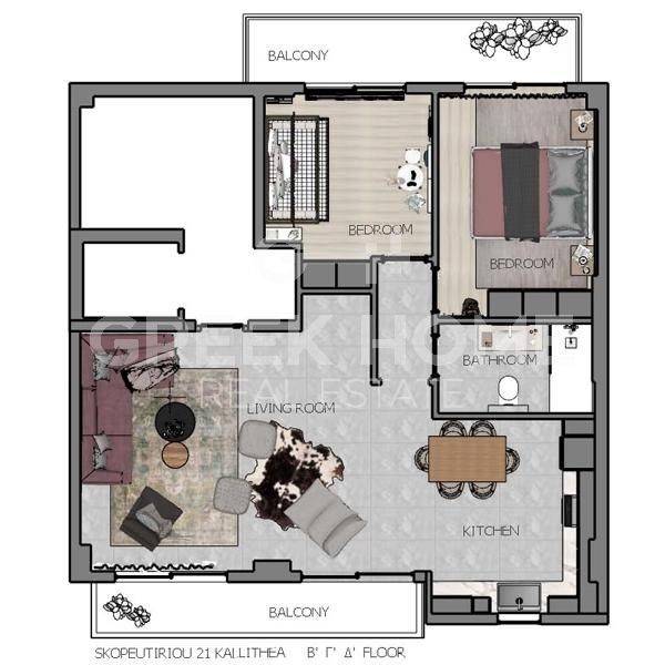 Kallithea (Attica - Southern Suburbs), Centre - Floor Apartment 81sqm unfurnished, bedrooms 2, 4th, under construction, constructionstage frames, year built 2026, energy class A, living room, kitchen, bathroom, heating type: autonomous (heat pump), air condition, parking covered, quiet, dual aspect apartment, luminous, corner, frontage, painted, drop ceiling, electric roller shutters, storage space, solar heater, external thermal insulation, balconies, tents, elevator, garden, thermal shut-off frames, double glazed windows, door screen, ceramic tiles floors, handicap ramp, separate kitchen, office, night electricity discount rate, secure door, alarm, video doorbell, luxurious, ev charger, satellite, internet, pets allowed, south-western orientation, special offer, close to market (up to 200m), close to park (up to 500m), close to square (up to 500m), close to super market (up to 200m), close to bus stop (up to 200m).