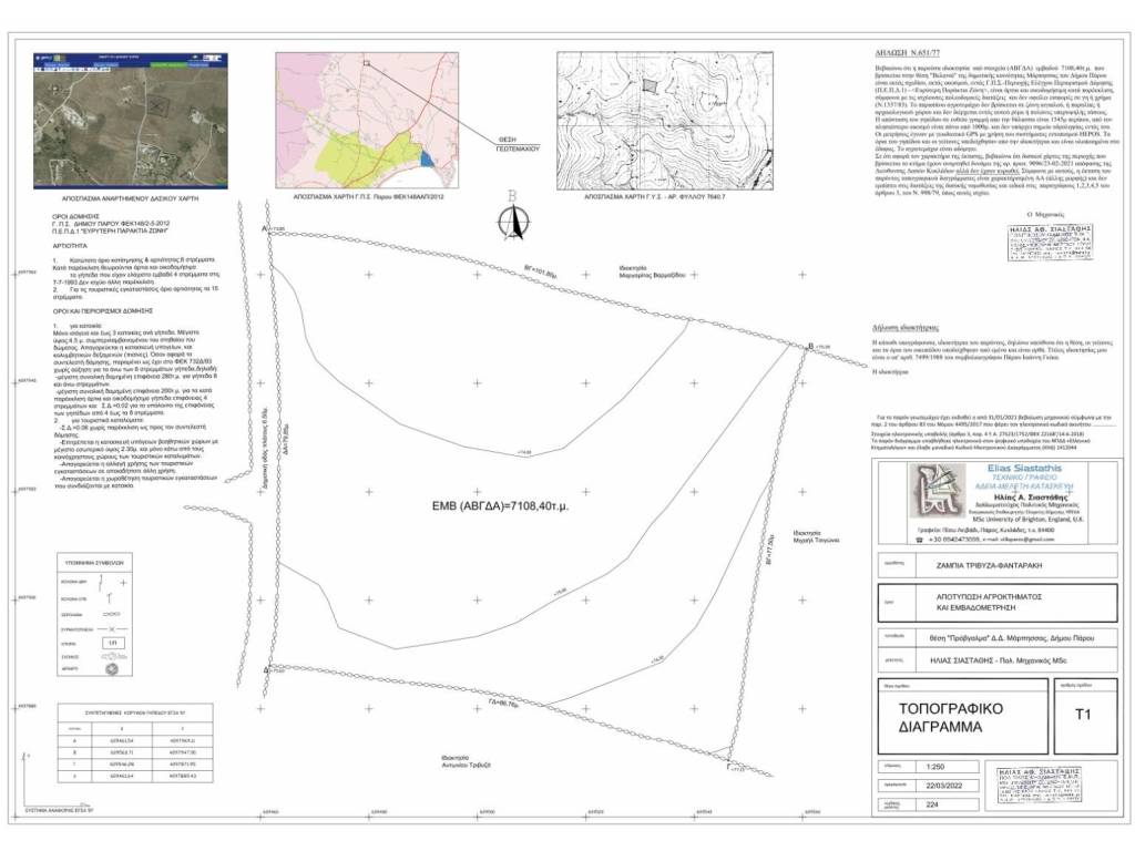 Διατίθεται προς πώληση αγροτεμάχιο συνολικής επιφάνειας 7.108 τ.μ., το οποίο βρίσκεται στη θέση Βελανιά Μάρπησσας Πάρου (Google maps 37.***/******* πρόσβαση από δημοτική ασφάλτινη οδό πλάτους 6,5m (επαφή σε μήκος 75,85m), θέα θάλασσα, εκτός οικισμού, άρτιο, οικοδομήσιμο, προσανατολισμός νοτιοανατολικός σε κοντινή απόσταση (1800m) απο την Χρυσή Ακτή, 18Km από το αεροδρόμιο, 18Km από το κεντρικό λιμάνι. Το Αγροτεμάχιο προσφέρει δυνατότητα δόμησης μίας, δύο ή τριών κατοικιών συνολικού εμβαδού 262 τ.μ. με επί πλέον δόμηση 30% (συνολικά 340 τ.μ.) σε περίπτωση κατασκευής κτιρίου με παραδοσιακή δόμηση και πάχος τοιχοποιίας 50cm. Τιμή: €300.000 http://****.**