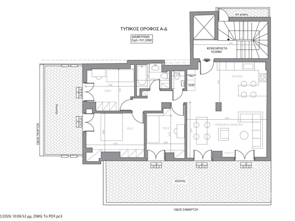 Corner penthouse apartment of 101 sq.m. with 59 sq.m. of terraces, featuring 3 bedrooms, an open-plan living room–kitchen–dining area, bathroom and WC. Equipped with synthetic window frames in wood-effect finish, autonomous heating with individual natural gas boiler, pre-installation for air-conditioning piping, alarm wiring, security entrance door, and a 23 sq.m. storage room in the basement & double-parking space (22 sq.m.) on the open ground floor.