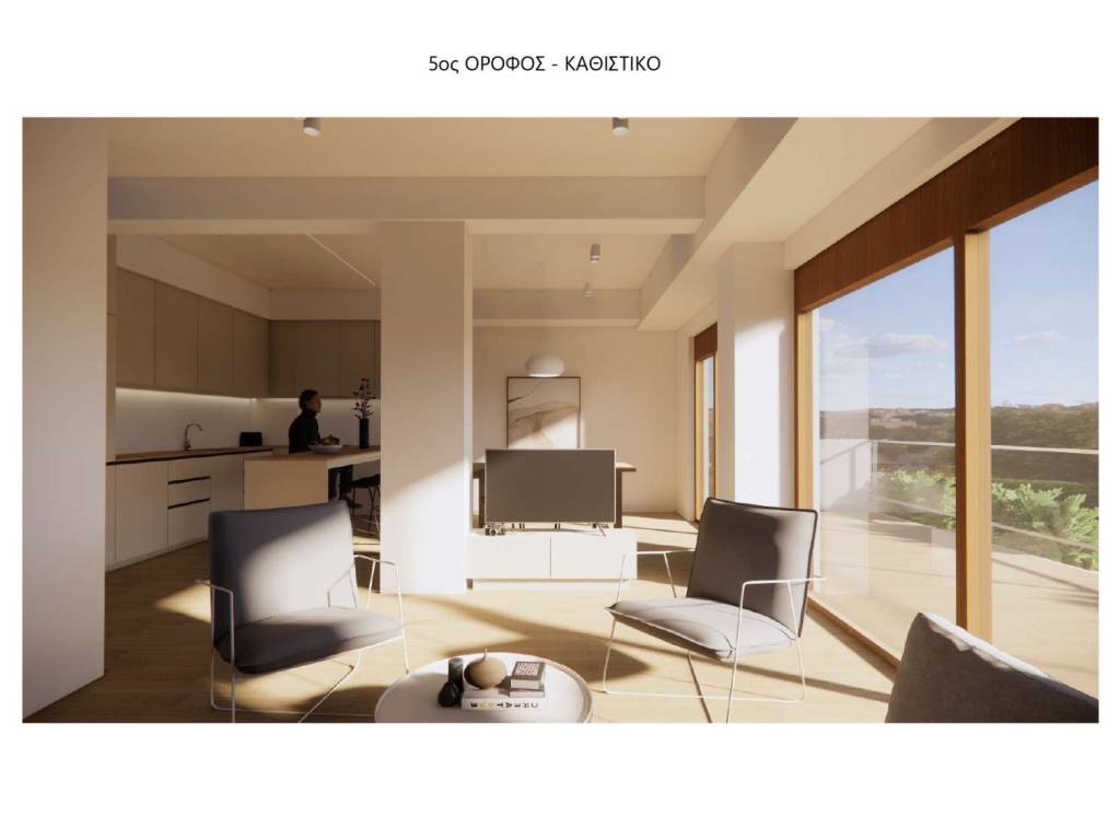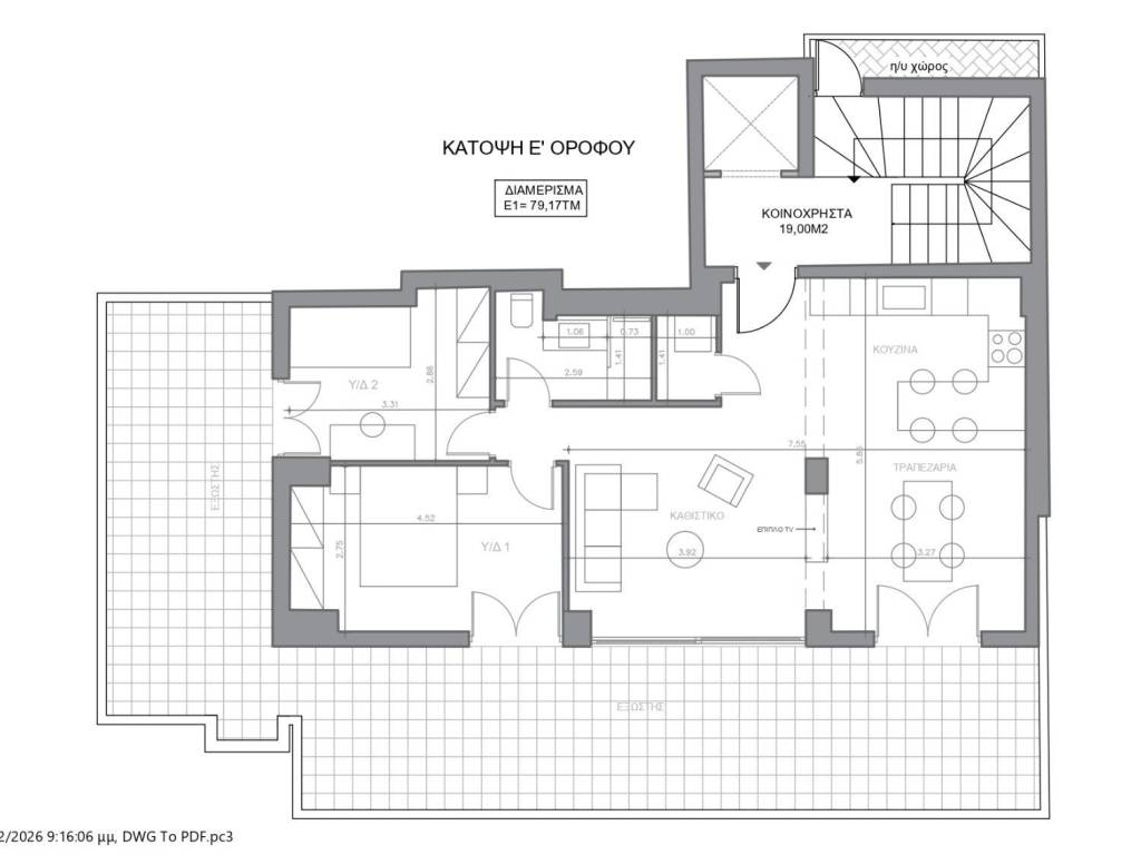 Corner penthouse apartment of 79 sq.m. with 55 sq.m. of terraces, featuring 2 bedrooms, an open-plan living room–kitchen–dining area, bathroom, small storage room inside the apartment & a 12 sq.m. storage room in the basement. Equipped with synthetic window frames in wood-effect finish, autonomous heating with individual natural gas boiler, pre-installation for air-conditioning piping, alarm wiring, security entrance door, and & double-parking space (22 sq.m.) on the open ground floor.