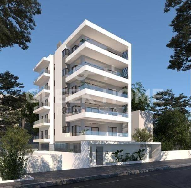 Glyfada, Pyrnari - Floor Apartment 140sqm bedrooms 3, 3rd, under construction, constructionstage plots, year built 2026, energy class A+, living room, kitchen, 2 bathrooms, wc, heating type: autonomous (heat pump), air condition, parking, quiet, dual aspect apartment, luminous, unobstructed view view, frontage, painted, storage space, solar heater, external thermal insulation, fireplace, balconies, large balconies, elevator, thermal shut-off frames, double glazed windows, door screen, wood floors, handicap ramp, secure door, alarm, video doorbell, luxurious, under floor heating, solar panels, internet, pets allowed, east-southern orientation.
