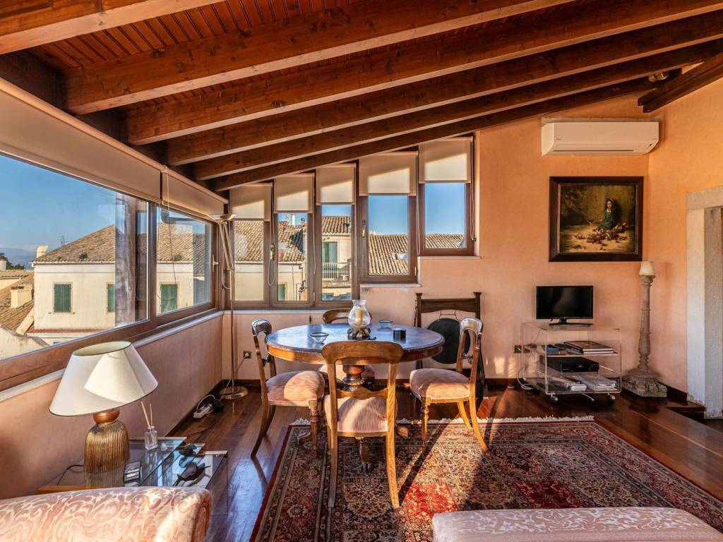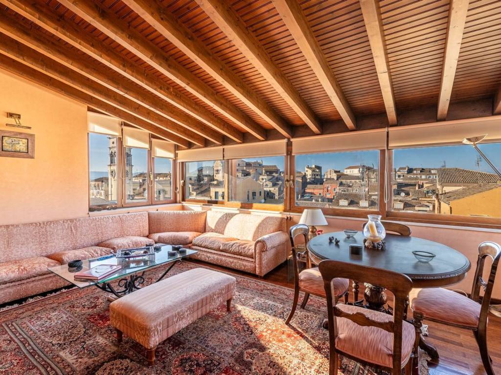 In the heart of Corfu’s Old Town, a UNESCO World Heritage site, on Liston and Kapodistriou Street, this rare 5th-floor penthouse is set in an authentic Venetian mansion dating to around 1900. The 129 sq.m. apartment was fully renovated in 1996 with respect to Venetian architecture, featuring an exposed wooden roof, high-quality wooden floors, Stucco Veneziano finishes by Italian artisans, designer furnishings, and a striking fireplace. The bright living room offers rare panoramic views of the New Fortress, Saint Spyridon Church, the Palace of St. Michael and St. George, and the Old Fortress. Similar views extend to other areas of the home. An elevator installation up to the 4th floor is planned for 2026. A unique residence combining history, elegance, and strong investment potential. Corfu is one of the Ionian Islands' most sought-after destinations, with a mature real estate market and strong international appeal. Known for its cultural heritage, excellent air connectivity, and premium tourist infrastructure, it continuously attracts buyers from Greece and abroad. Demand focuses on sea-view villas, tourist complexes, and historic properties in the Venetian old town. Despite competition, the market remains vibrant, offering high returns through short-term rentals and strong capital appreciation for luxury assets.