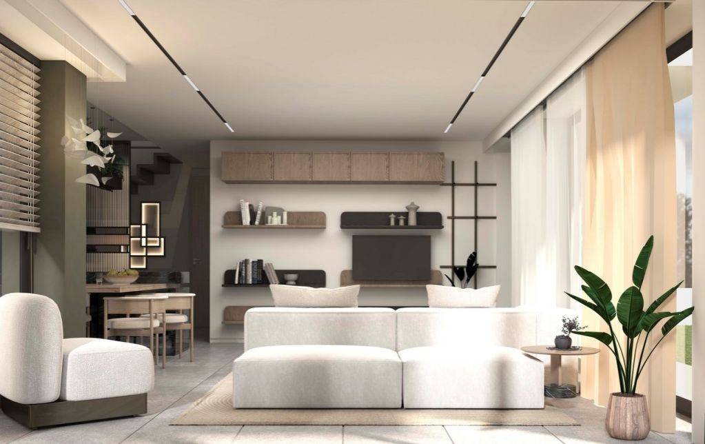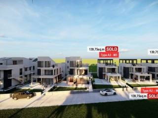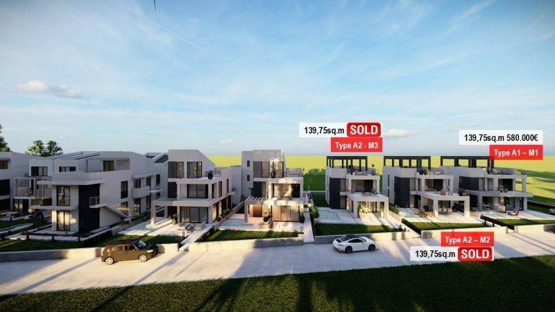 2 Τριώροφες Μονοκατοικίες 140,23 τ.μ. (σαλοκουζίνα, τραπεζαρία, 4Υ/Δ, 3 μπάνια). Στο ισόγειο της οικίας βρίσκεται η σαλοκουζινα, η τραπεζαρία, ένα υπνοδωμάτιο και το μπάνιο. Μία εσωτερική σκάλα οδηγεί στον όροφο του σπιτιού που φιλοξενεί 2 υπνοδωμάτια, 2 μπάνια και βεράντες. Στη σοφίτα βρίσκεται το 4o υπνοδωμάτιο και μια μεγάλη βεράντα με μοναδική θέα και design. Ο προαύλιος χώρος είναι όμορφα διαμορφωμένος με μπάρμπεκιου και ιδιωτική πισίνα ενώ δίπλα στην μονοκατοικία υπάρχει χώρος στάθμευσης.