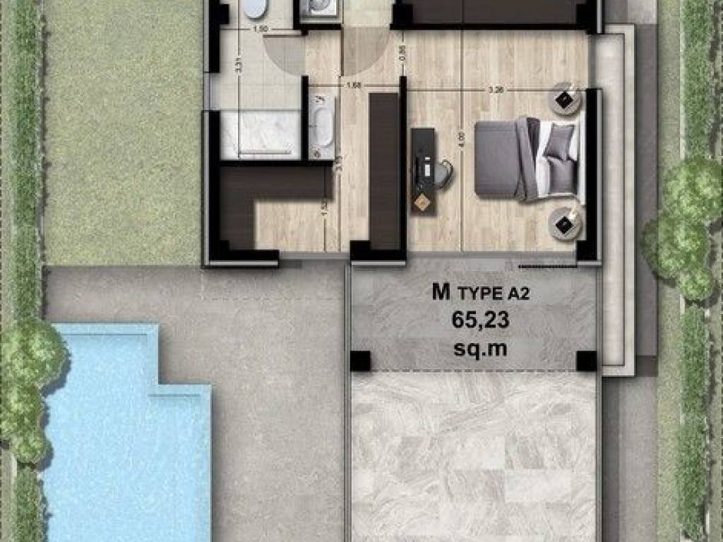 14 διαμερίσματα από 28,53 τ.μ. έως 55,85 τ.μ. τα οποία αποτελούνται από σαλόνι-κουζίνα, 1 ή 2 υπνοδωμάτια και ένα μπάνιο. Διαθέτουν όμορφα διαμορφωμένους εξωτερικούς χώρους, κοινόχρηστη πισίνα και χώρους στάθμευσης.