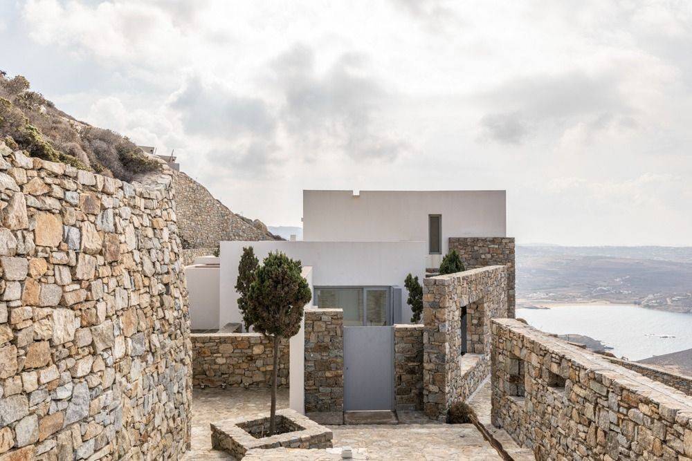 Mykonos, Ftelia – Villa 245 sq.m. on a fully landscaped plot of 7,727 sq.m. Three spacious reception areas, 3 bedrooms, 3 full bathrooms and a dressing area, fully equipped kitchen, 3×10 m swimming pool, helipad, unlimited (unobstructed) view, minimal aesthetic.