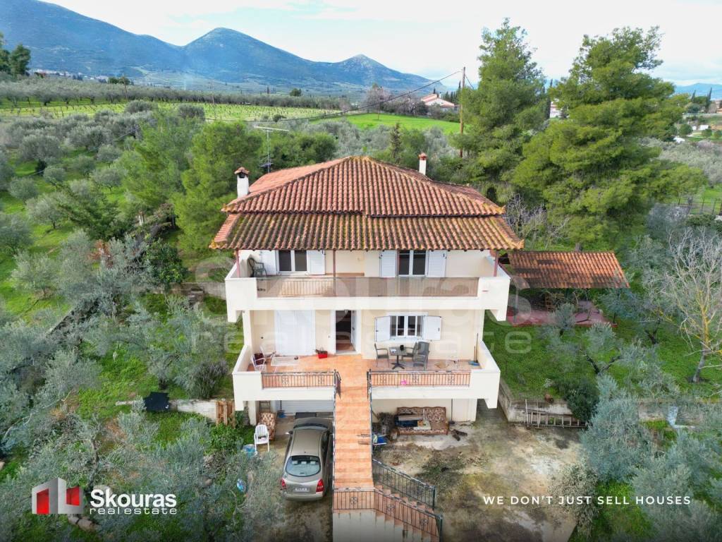 In the area of Chiliomodi, Corinth, a detached house with a total area of 285 sq.m. is available for sale, of which 190 sq.m. are main living areas and the additional 95 sq.m. are auxiliary and storage spaces. The property is situated on a 3,275 sq.m. plot, of which 2,955 sq.m. lie within the settlement, offering privacy, tranquility, and direct contact with nature, while being a short distance from Corinth and with easy access to Athens. The residence was built in 2004 and is developed over three levels. The main living areas (190 sq.m.) include two spacious and bright living rooms, a kitchen, three bedrooms, one bathroom, and one WC. The property is airy, well-lit, and cross-ventilated, with unobstructed views of the mountains, greenery, and open spaces, providing a sense of peace and relaxation. The basement level, with an area of 95 sq.m., currently functions as a closed parking space for four cars and as storage. Additionally, it can be converted into an independent and self-contained living area, as it has the same square footage as each of the other floors, allowing the creation of additional living space with a bedroom, bathroom, and lounge — ideal for hosting guests or investment purposes. The heating system is autonomous with oil, and the property features radiators, a boiler, aluminum frames with double glazing, and tiled floors. It is delivered furnished and equipped with electrical appliances. Additional features include window screens, a storage room, internal staircase, large verandas, and an internal courtyard. The 3,5-acre outdoor area is landscaped with olive trees and natural vegetation, creating an ideal environment for a permanent or holiday home, combining countryside privacy with immediate access to essential amenities. The property is close to public transport, schools, the village square, a church, supermarkets, and dining options, just 1,000 meters from the village center, 17 km from Corinth, 18 km from the sea, 1,000 meters from a bus stop, and approximately 125 km from Athens International Airport. This property is an ideal choice for those seeking a high-quality residence immersed in nature, with spacious living areas, privacy, and excellent access to both Corinth and Athens. Skouras Real Estate #1 Greek Real Estate Agency in the Peloponnese 4 Offices: Nafplio | Kalamata | Corinth | Porto Heli 3,000+ Properties | 18+ Years of Experience | Support in 5 Languages Marketing & Website - European Property Awards 2020 Technical Marketing & Development - EPPA 2022 & 2024 Call Center: 27520-29529 Mobile: +30 6973670724 Email: diam.skourasre@gmail.com Property Manager: Theodoros Diamantopoulos More than 3,000 properties available at: www.skourasrealestate.gr Note: Property information is based on details provided by the owners. Skouras Real Estate is not responsible for any inaccuracies. ID or passport required for property visits. Locations on maps are approximate.