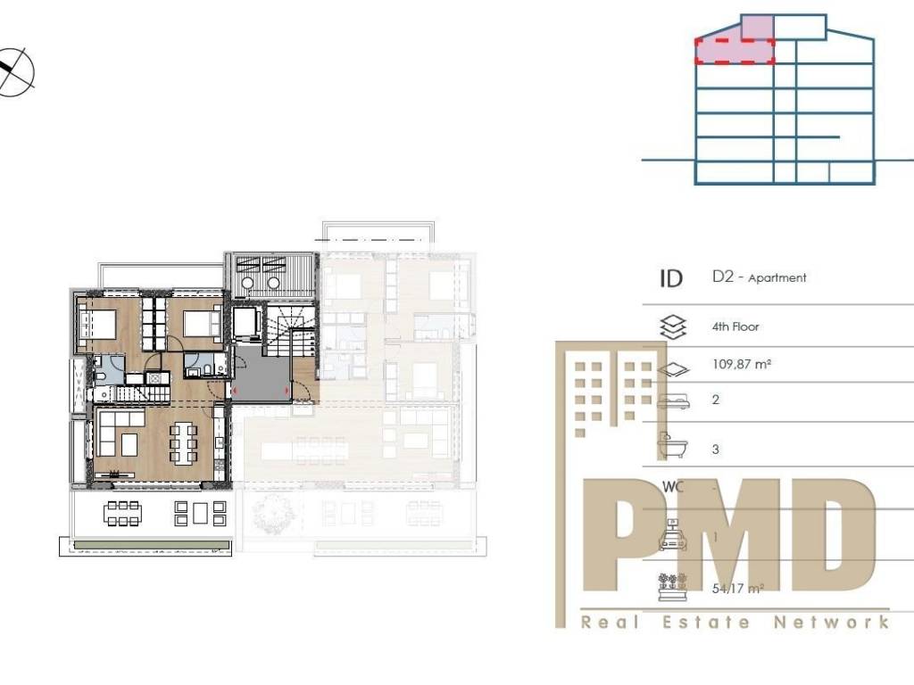 Penthouse Maisonette in Varkiza on the 4th & 5th floor with total area of 109.87 sq.m. The 4th floor total 88.87 sq.m internal area features a large open-plan kitchen, living, and dining area opening up to a spacious southwest-facing balcony. The sleeping quarters are located at the rear of the apartment, consisting of 1 Master bedroom with an en-suite bathroom and 1 bedroom with a bathroom shared by the living quarters and bedroom. The bedrooms have access to a balcony at the back of the apartment. An internal elevator and staircase leads up to the 21.00 sq.m internal area on the 5th floor. Here their is a living area and bathroom that opens up to a private roof garden. There will only be a partial view of this unit. The two balconies on the 4th floor and the roof garden on the 5th floor total 54.17 sq.m. Included 1 private underground parking space and there is also a private storage unit in the basement. The plot consists of double entrance. This property is a short five-minute walk to the Varkiza seaside, cafes, and restaurants, and only 1 km from Varkiza beach. Additionally, the beach and center of Vouliagmeni are just a short 2 km drive away. This is a beautiful residence in the heart of Varkiza, built with the latest materials and design on the Athens Riviera.