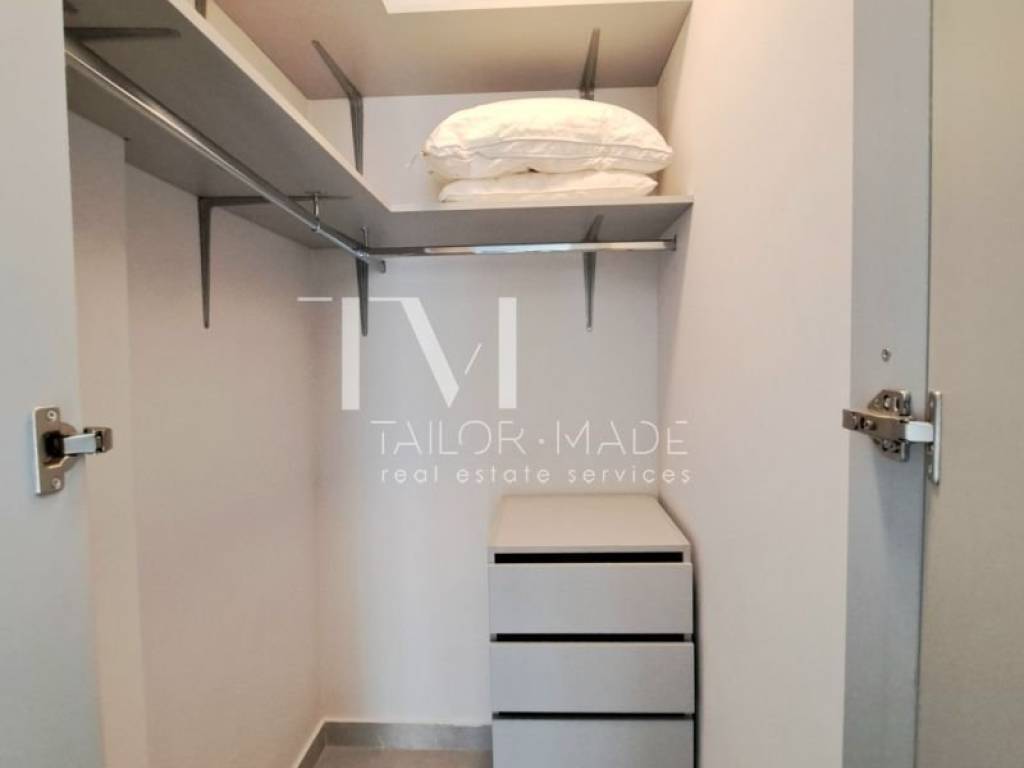 The interior layout is designed with a focus on practicality and comfort. It consists of an open-plan living and kitchen area equipped with all necessary electrical appliances, a bathroom, and a bedroom featuring a dedicated walk-in closet for organized storage. The apartment is offered fully furnished and is ready for immediate move-in.