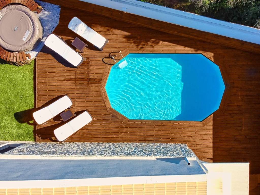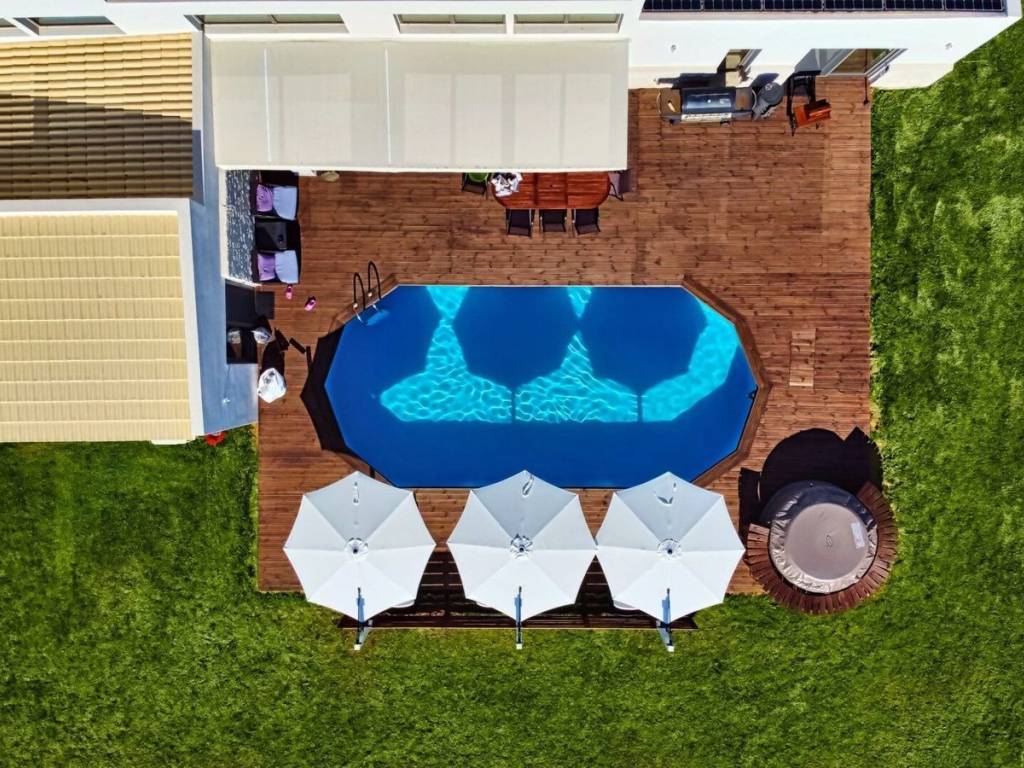 The main villa (approx. 148 sqm) features 3 bedrooms, 2 bathrooms, and a generous private pool, making it an ideal space for private family living or rentals for larger groups. The two smaller villas (approx. 68 sqm each) feature a practical layout, perfect for short-term rentals or guest accommodations. Each villa consists of a 48 sqm ground floor and a 20 sqm attic, along with 2 bedrooms, 1 bathroom, a dedicated garden and fenced-in privacy with a private pool and whirlpool.
