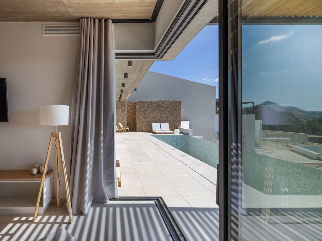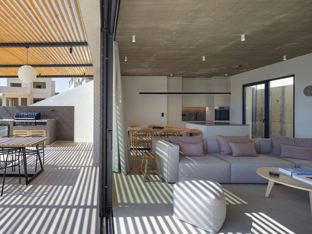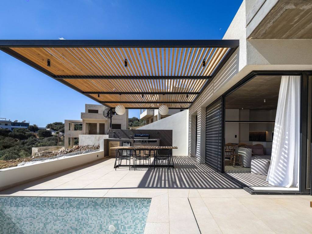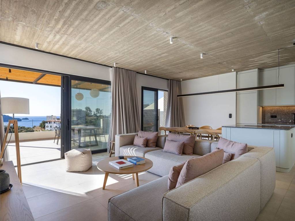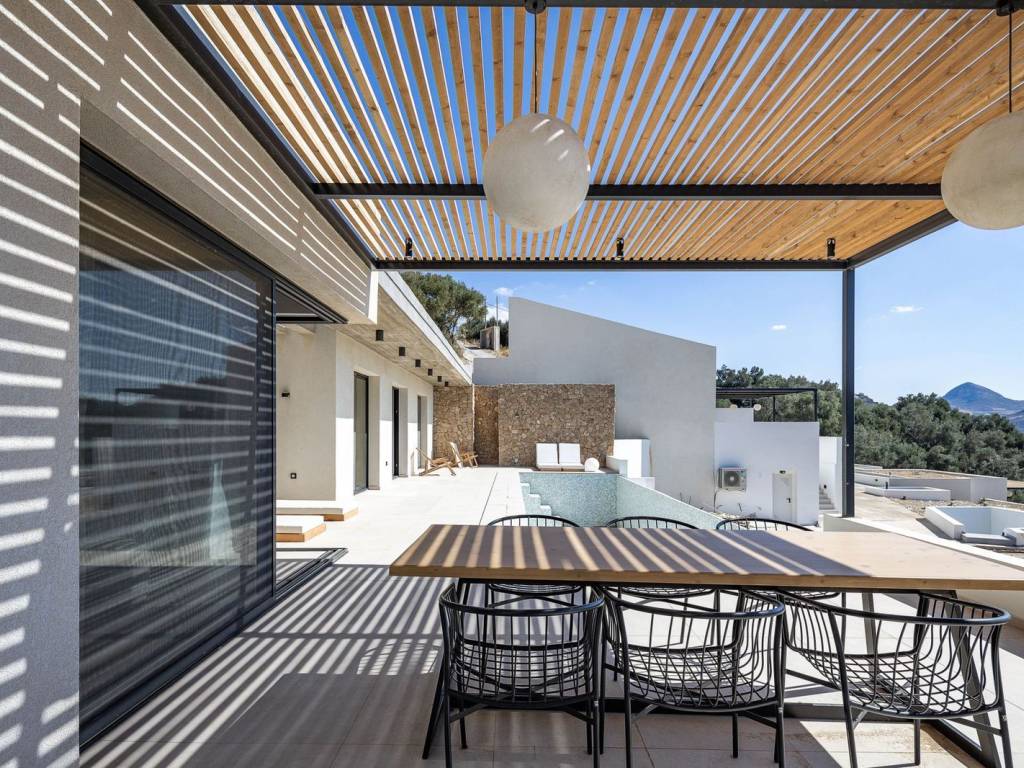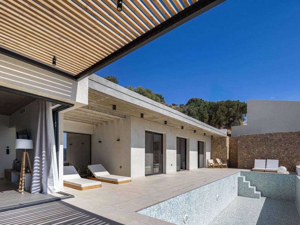 In Mariou, this new four-villa collection is designed for effortless sea-view living, with clean contemporary lines and a calm Mediterranean feel. Created by one of Greeceâs leading architectural teams and following the success story of the first Island Breeze project, it has already drawn strong early interest.The four villas are designed in the 'cave' style, featuring green roofs. Cave villas offer a highly bioclimatic living environment, naturally insulated by the earth to maintain stable indoor temperatures throughout the year. This results in significantly reduced energy needs for heating and cooling, enhanced thermal comfort and a more sustainable way of living. By working in harmony with the natural landscape, cave architecture minimises environmental impact while delivering a serene, efficient and exceptionally comfortable home.Across the project, the layout is designed around everyday indoorâoutdoor living. The open-plan kitchen and bedrooms flow straight onto the terrace, keeping the sea view present from the moment you step inside. All bedrooms and the kitchen-dining area remain oriented toward the outdoor living area and the view. The terraces are shaded by generous pergolas for day-to-night outdoor dining and lounging. Landscaped spots add a discreet architectural finish that supports privacy and a sense of connection to the surroundings.A separate laundry room keeps practical use discreet and organised. Atriums bring daylight and airflow into inner areas, including bathrooms, so the villas stay bright and fresh.Please note: The images used in this listing are for illustrative purposes only and are intended to provide an impression of the final project. The photographs are from the previous, highly successful Island Breeze Villas 1 project. They may not accurately reflect the exact specifications, finishes or layout of the second Island Breeze project.