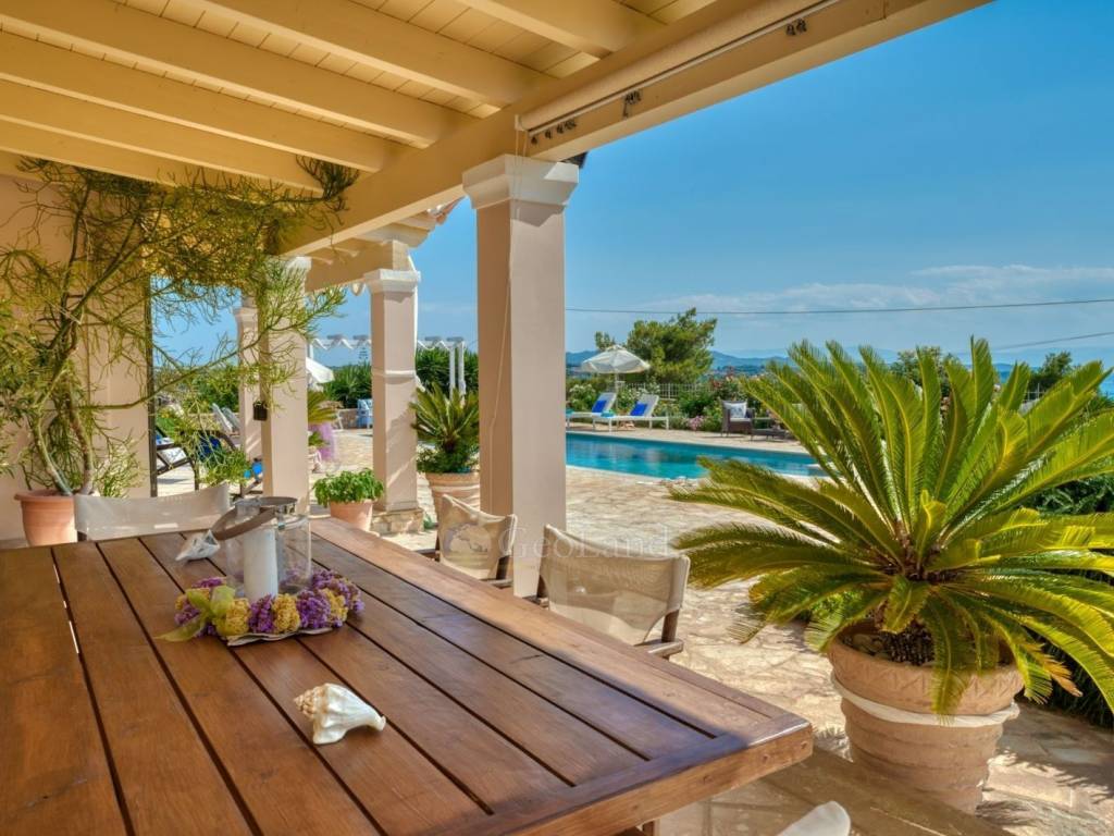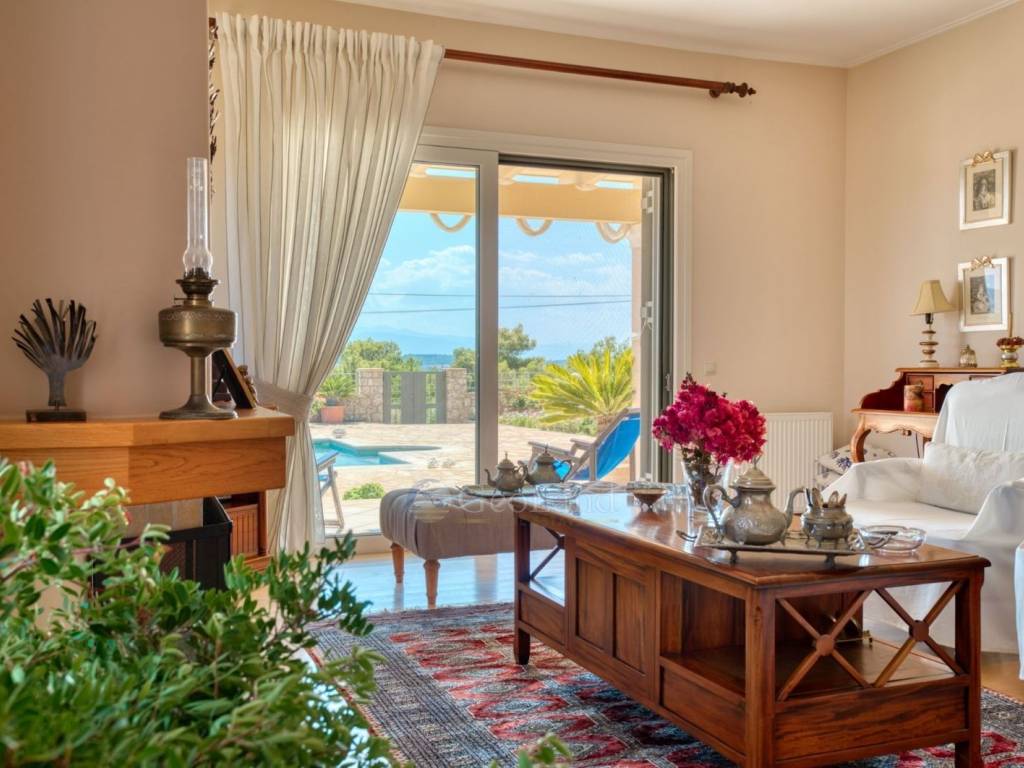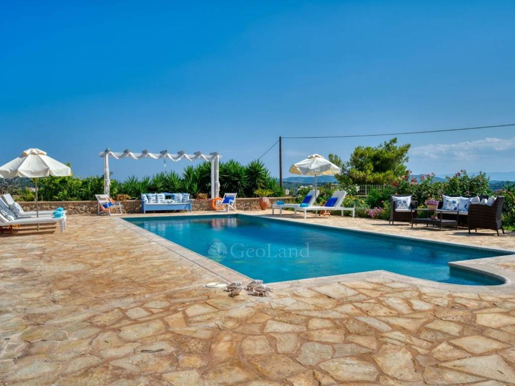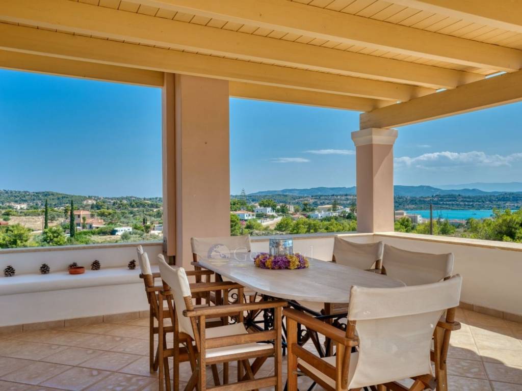 The ground floor terrace offers stunning views that extend to the bay of Portocheli and beyond. The large swimming pool, combined with comfortable sun loungers, creates an ideal space for relaxation and enjoyable moments under the sun.